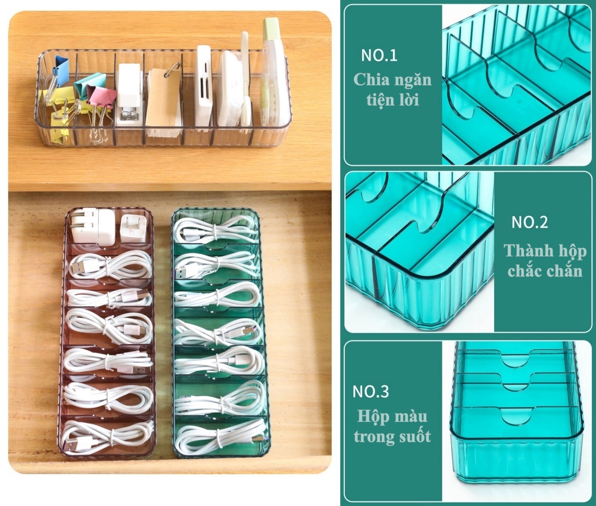 Mua tại TiktokHộp nhựa màu trong suốt đựng phụ kiện dây cáp sạc, vật dụng văn phòng nhỏ gọn có chia ngăn tiện lợi Hộp nhựa được làm bằng chất liệu nhựa PS cao cấp không mùi hôi, màu trong suốt giúp bạn dễ tìm kiếm đồ vật khi cần. Hộp được thiết kế chia làm 7 ngăn nhỏ để đựng cáp sạc, tai nghe, remote TV, cáp USB, chìa khóa và các vật dụng văn phòng nhỏ gọn khác. Sắp xếp các và phụ kiện của bạn vào hộp ngăn nắp và các hộp có thể được chồng lên giau giúp không gian của bạn không gọn gàng hơn. Bạn có thể nhanh chóng tìm thấy chúng khi bạn cần nhờ hộp màu trong suốt. Kích thước hộp: 26.0 x 9.5 x 4.5cm