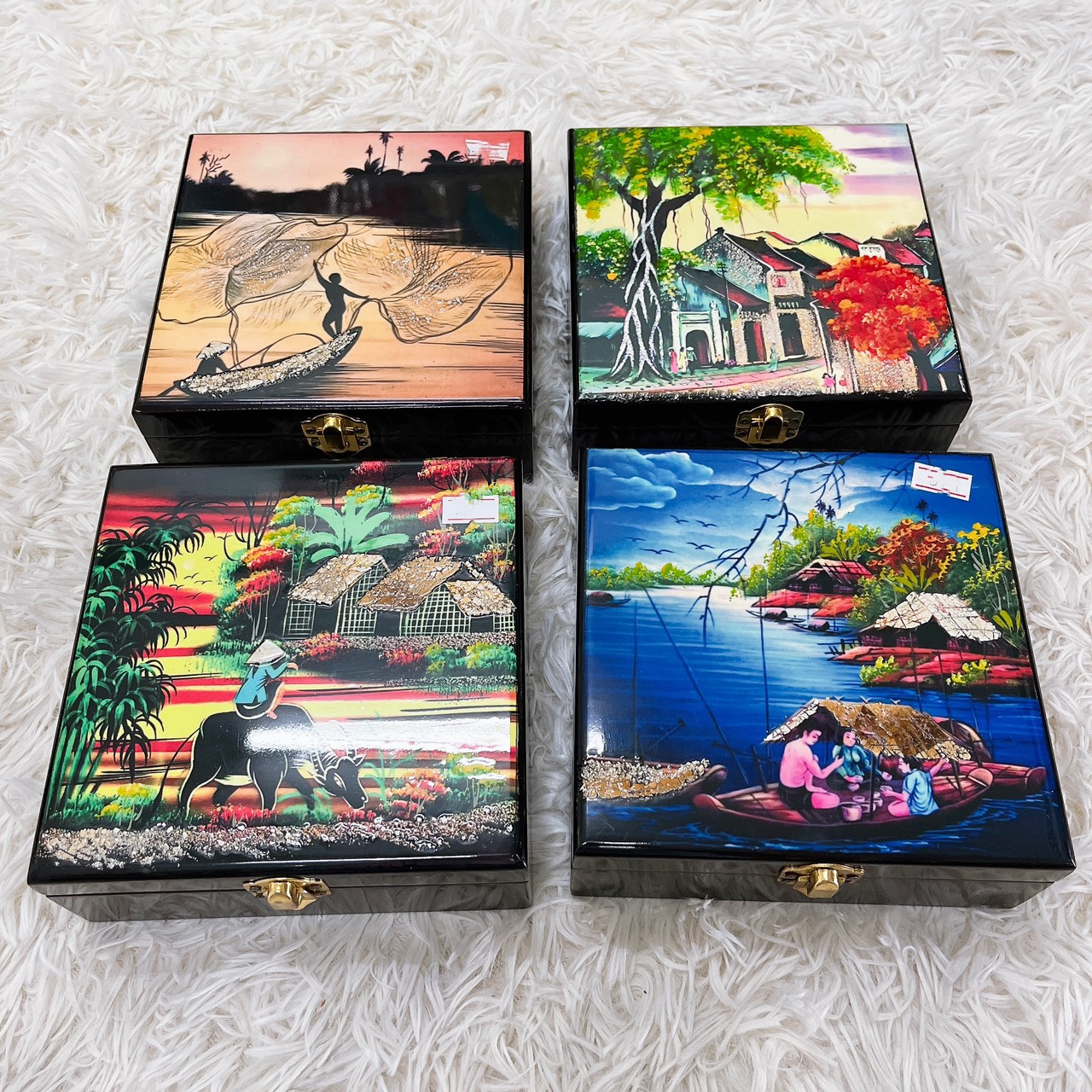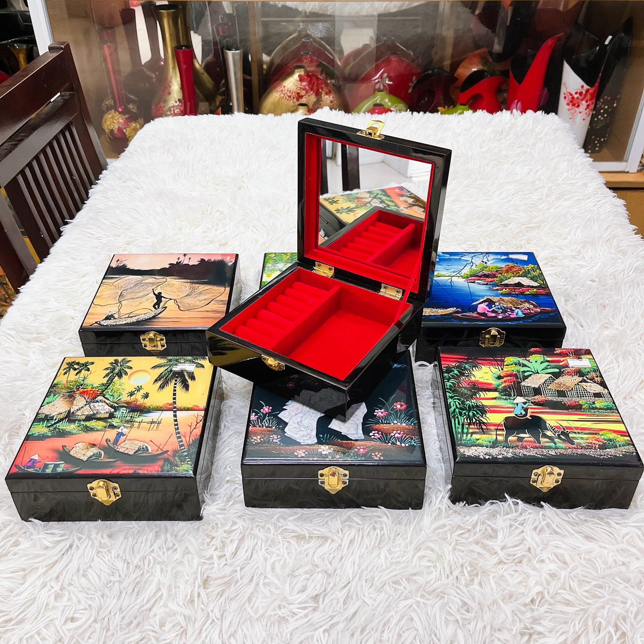Kích thước: hộp hình vuông 16cm, bên trong có lót nhung và có gương.