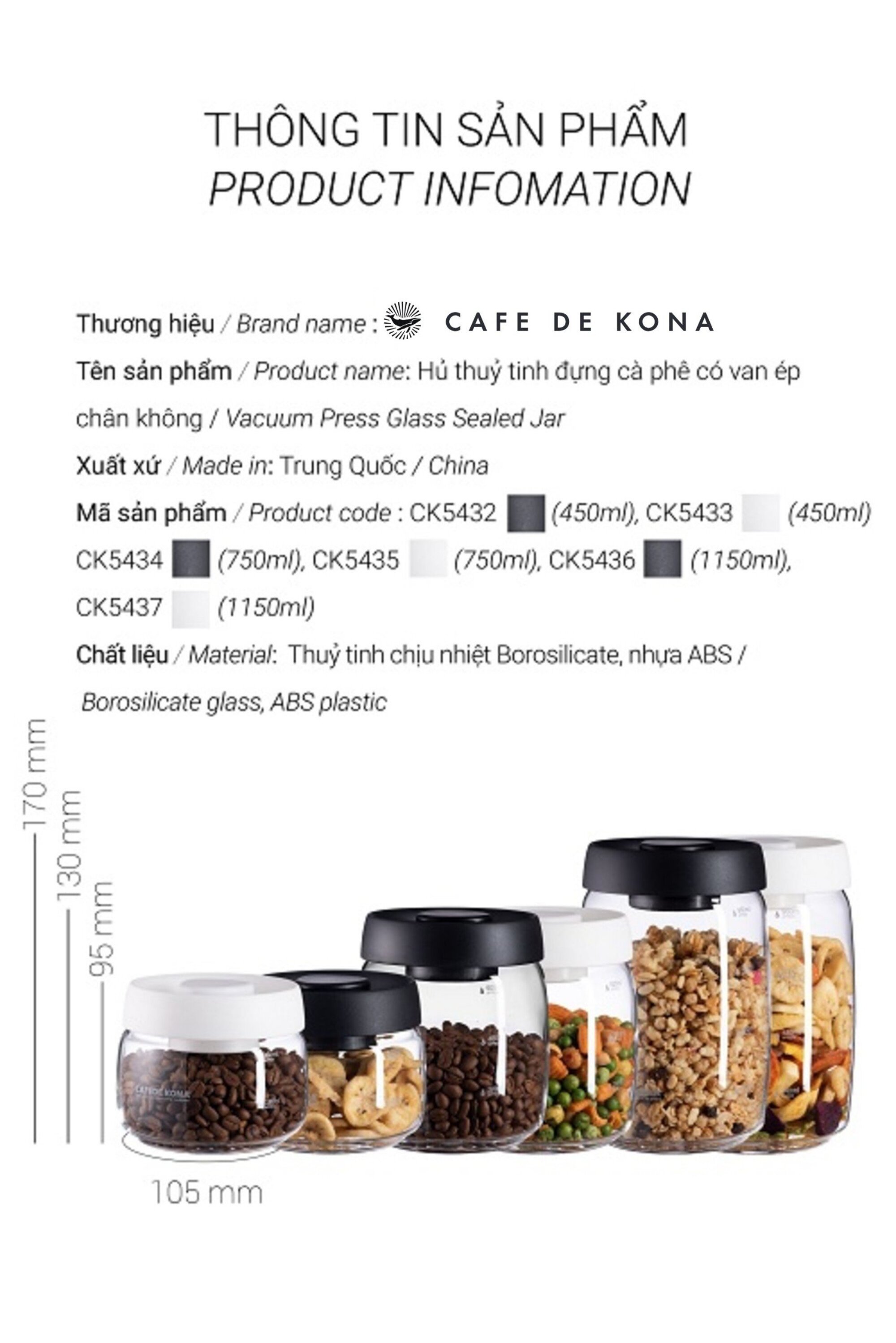 HŨ THỦY TINH HÚT CHÂN KHÔNG CAO CẤP CAFE DE KONA Giữ thực phẩm chuẩn vị hương thơm vốn có Được làm từ thủy tinh Borosilicate cao cấp cùng bề mặt nhẵn mịn và độ trong suốt cao. Hũ thủy tinh Cafede Kona giúp chống sốc nhiệt, không nứt vỡ khi thay đổi nhiệt độ bất chợt. Phần nắp đậy với van 1 chiều hút không khí ra ngoài. Phần thân bình với thiết kế vừa tay cầm, chống trơn trượt, giúp bạn thuận tiện trong việc cầm nắm và di chuyển. Sử dụng để bảo quản hạt cà phê vừa rang. Đựng các loại thực phẩm khô như ngũ cốc, đường, bột, bánh kẹo,… vừa an toàn lại vừa tiện lợi. Với 3 kích thước khách nhau, có thể đáp ứng hầu hết các mục đích sử dụng của người dùng. Dung tích : 450ml, 750ml, 1150ml .