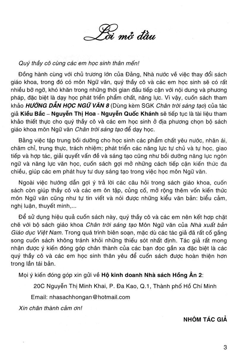 Hướng Dẫn Học Ngữ Văn 8 - Tập 2 (Dùng Kèm SGK Chân Trời Sáng Tạo)   Đồng hành cùng với chủ trương lớn của Đảng, Nhà nước về việc thay đổi sách giáo khoa, trong đó có môn Ngữ văn, quý thầy cô và các em học sinh sẽ có rất nhiều bỡ ngỡ, khó khăn trong những thời gian đầu tiếp cận với nội dung và phương pháp, đặc biệt là dạy học phát triển phẩm chất, năng lực. Vì vậy, cuốn sách tham khảo HƯỚNG DẪN HỌC NGỮ VĂN 8 (Dùng kèm SGK Chân trời sáng tạo) của tác giả Kiều Bắc – Nguyễn Thị Hoa - Nguyễn Quốc Khánh sẽ tiếp tục là tài liệu tham khảo thiết thực cho quý thầy cô và các em học sinh ở địa phương chọn bộ sách giáo khoa môn Ngữ văn Chân trời sáng tạo để dạy học. Bằng việc tập trung bồi dưỡng cho học sinh các phẩm chất yêu nước, nhân ái, chăm chỉ, trung thực, trách nhiệm; phát triển các năng lực tự chủ và tự học, giao tiếp và hợp tác, giải quyết vấn đề và sáng tạo cũng như bồi dưỡng năng lực ngôn ngữ và năng lực văn học, cuốn sách gợi mở những cách tiếp cận kiến thức đa chiều, giúp các em phát huy tư duy sáng tạo trong việc học môn Ngữ văn. A. Những Kiến Thức Văn Học Cần Ghi Nhớ B. Văn Bản Đọc - Hướng Dẫn Soạn Bài Ngoài việc hướng dẫn gợi ý trả lời các câu hỏi trong sách giáo khoa, cuốn sách còn giúp thầy cô và các em ôn tập, củng cố, mở rộng thêm vốn kiến thức môn Ngữ văn cũng như tự tin viết và nói được những kiểu văn bản: biểu cảm, nghị luận, thuyết minh,... Để sử dụng hiệu quả cuốn sách này, quý thầy cô và các em nên kết hợp chặt chẽ với bộ sách giáo khoa Chân trời sáng tạo Môn Ngữ văn của Nhà xuất bản Giáo dục Việt Nam. Trong quá trình biên soạn, mặc dù các tác giả đã rất cố gắng song cuốn sách không tránh khỏi những thiếu sót nhất định. Tác giả rất mong nhận được ý kiến đóng góp chân thành của các bạn đọc gần xa đặc biệt là các quý thầy cô và các em học sinh thân yêu để cuốn sách được hoàn thiện hơn trong lần tái bản.