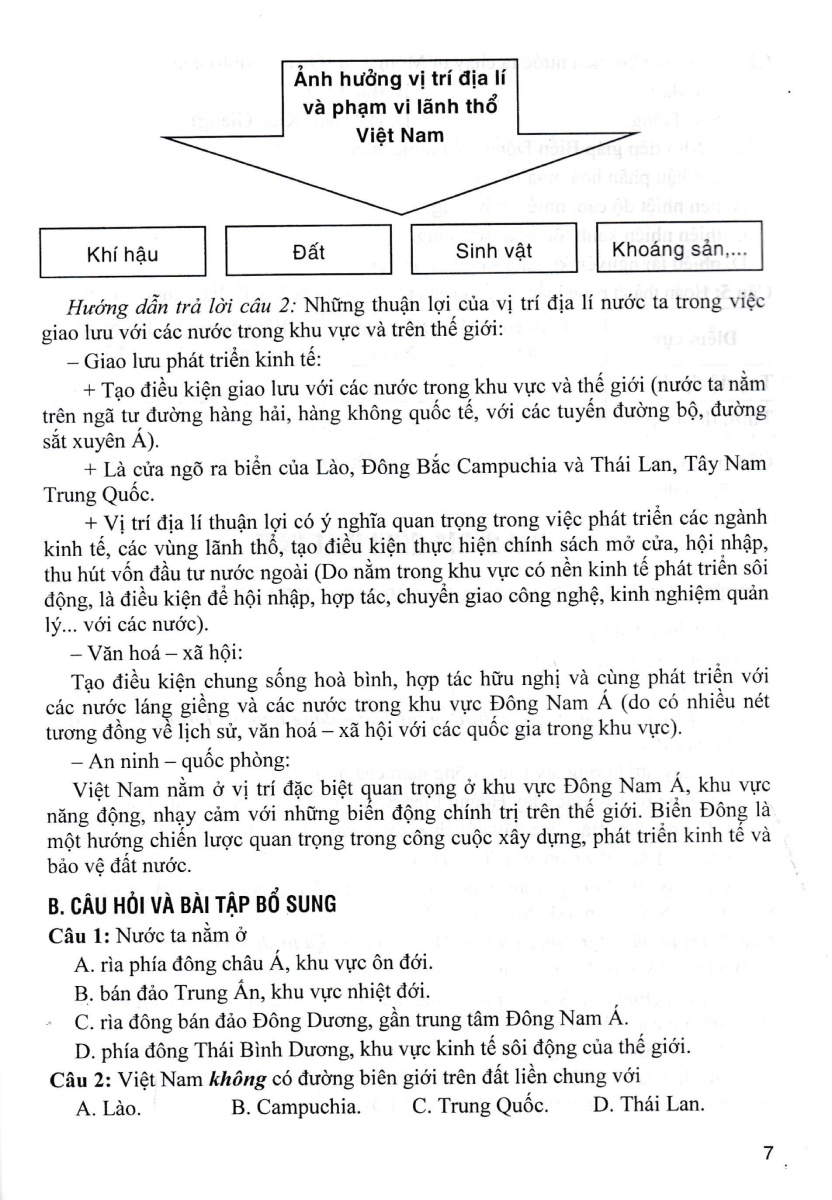 Trong phần này, hướng dẫn trả lời các câu hỏi và bài tập giữa bài học, phần luyện tập và vận dụng trong sách giáo khoa. Bên cạnh đó tác giả còn đưa ra các câu hỏi luyện tập bổ sung để giúp các em học sinh tự đánh giá, kiểm tra và rèn luyện các kỹ năng Địa lí nhằm nâng cao kiến thức trong học tập.