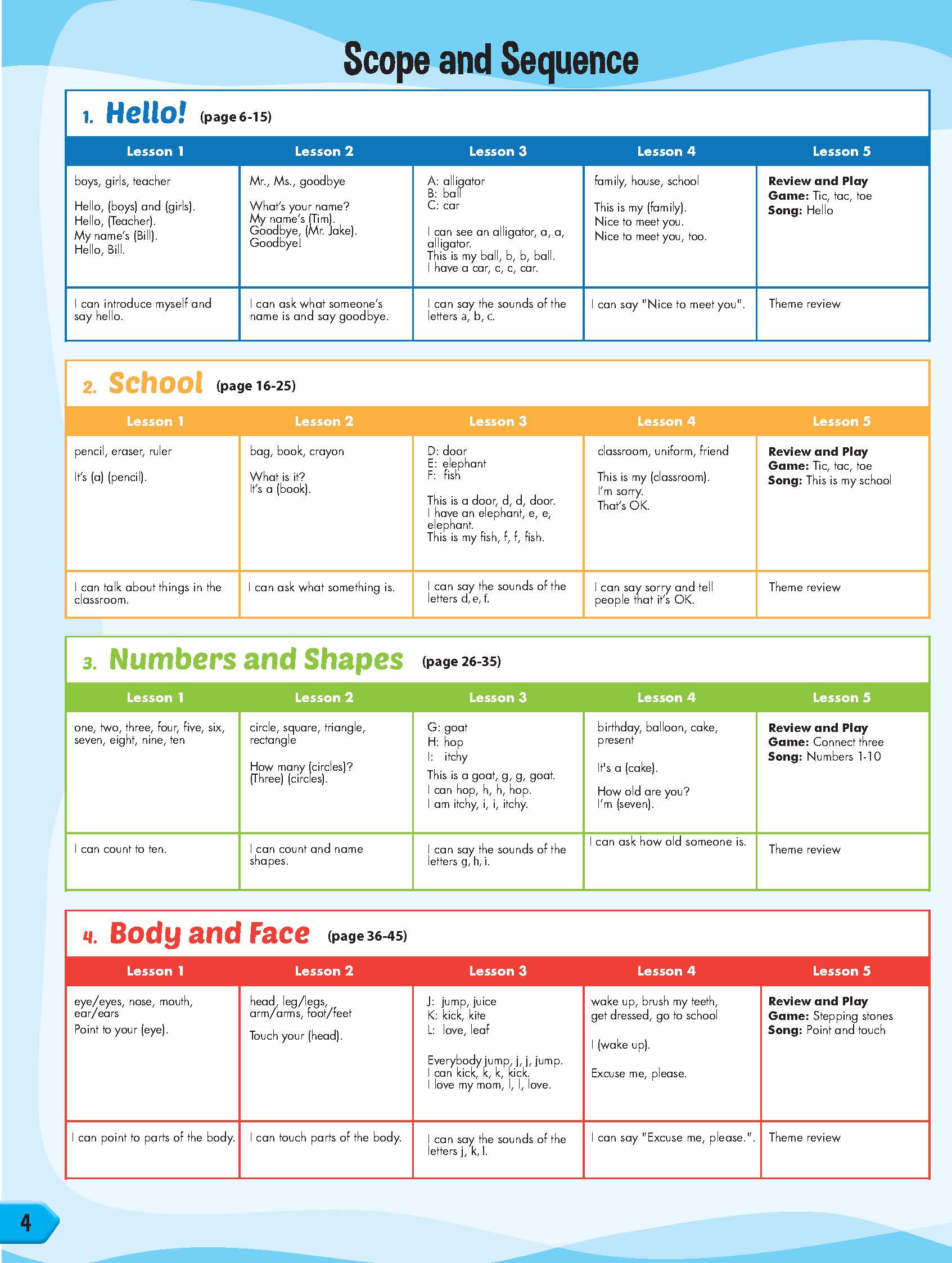 Sách: Learning English 4 - Dành Cho Học Sinh Lớp 4 NỘI DUNG VÀ CẤU TRÚC CỦA QUYỂN SÁCH : Bảng mục lục: Chỉ rõ các mục tiêu chính và trọng tâm của mỗi bài