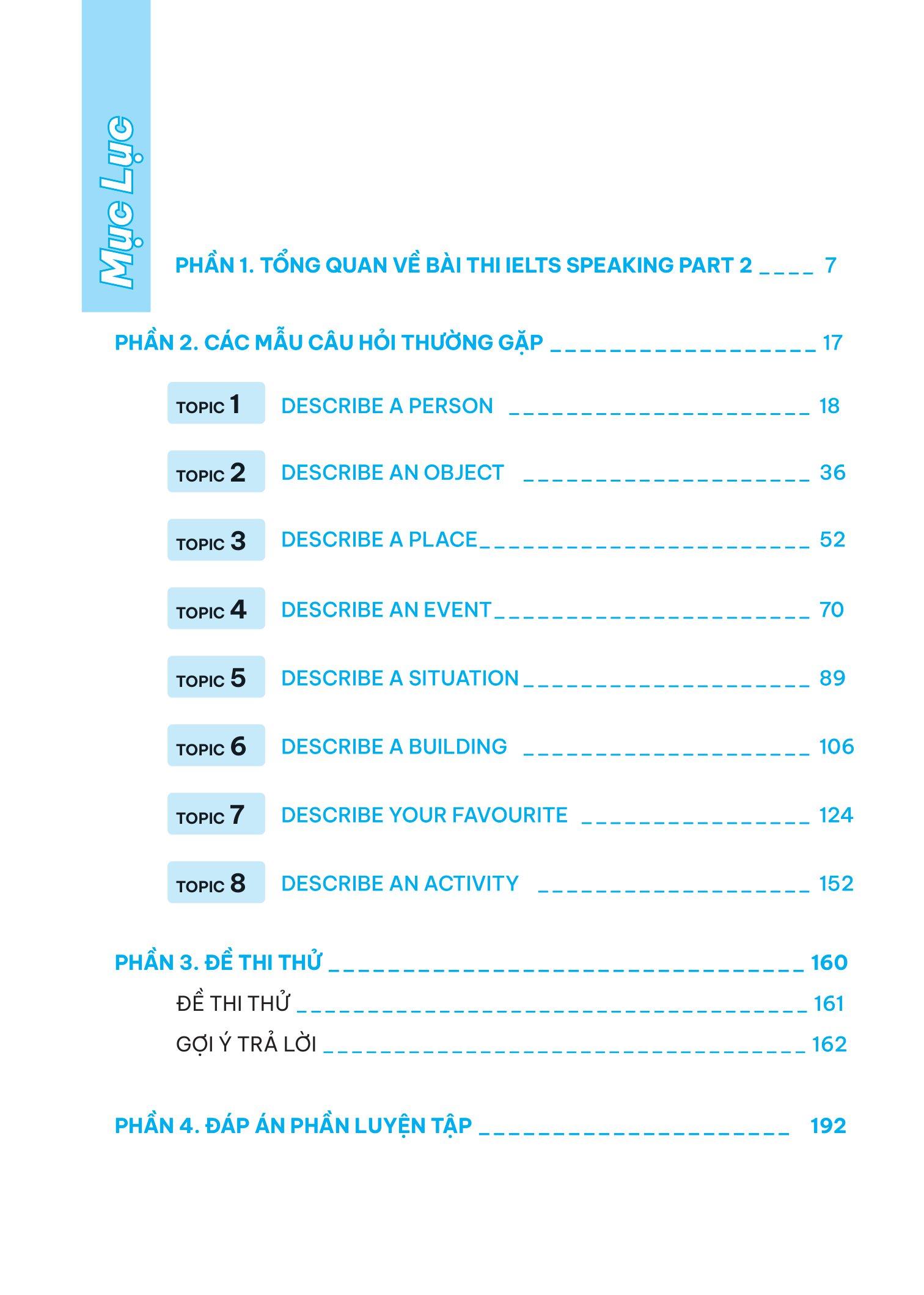 Phần này sẽ phân tích bài nói mẫu của 8 chủ đề phổ biến trong bài thi IELTS Speaking part 2. Ngoài ra cuốn sách còn cung cấp các cấu trúc gợi ý, các từ vựng “đắt” cùng bài tập tự luyện giúp bạn dễ dàng chinh phục Band 7+