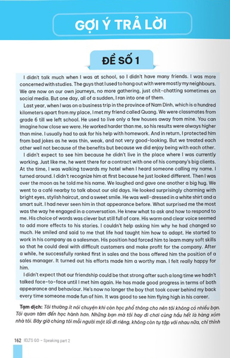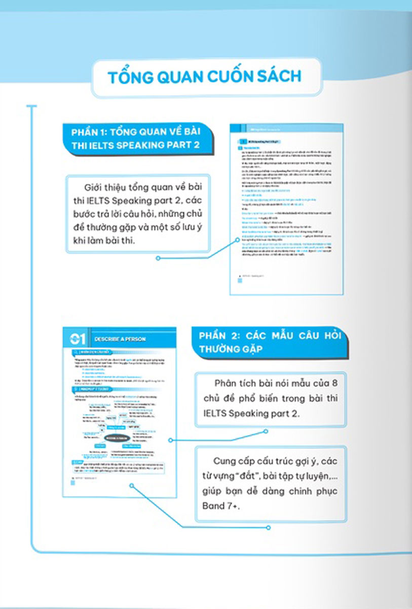 Phần này sẽ phân tích bài nói mẫu của 8 chủ đề phổ biến trong bài thi IELTS Speaking part 2. Ngoài ra cuốn sách còn cung cấp các cấu trúc gợi ý, các từ vựng “đắt” cùng bài tập tự luyện giúp bạn dễ dàng chinh phục Band 7+