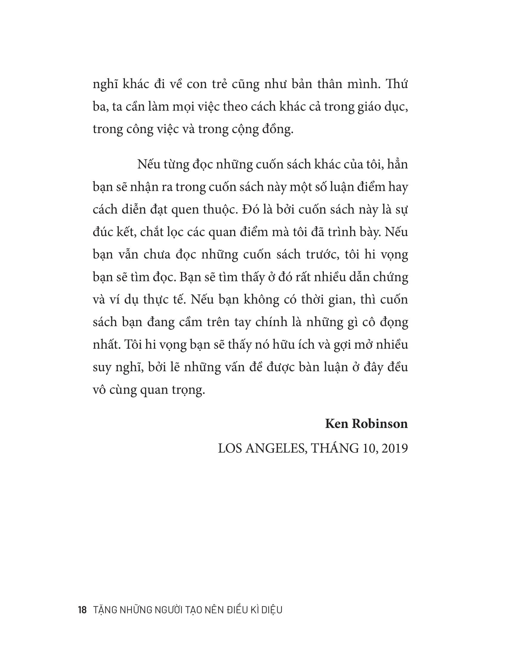Sir Ken Robinson (1950-2020) là chuyên gia toàn cầu về sáng tạo, giáo dục và tiềm năng con người. Ông là tác giả bán chạy của The New York Times với các đầu sách đã được dịch ra 24 ngôn ngữ. Bài nói chuyện mang tính đột phá của ông trên TED Talks, Do Schools Kill Creativity (Trường học có giết chết sự sáng tạo), đến nay vẫn thu hút hàng chục nghìn lượt xem mỗi ngày. Đây là con số mà theo Chris Anderson, Giám đốc TED, tương đương với việc bán hết vé cho Millennium Dome mỗi đêm trong 15 năm liên tiếp. Ông đã hợp tác với các nhà lãnh đạo, nhà giáo dục và các tổ chức trên thế giới để ủng hộ vai trò của sáng tạo trong học tập và cuộc sống. Những hiểu biết sâu sắc của ông đã định hình các chính sách và hoạt động giáo dục trên toàn thế giới.