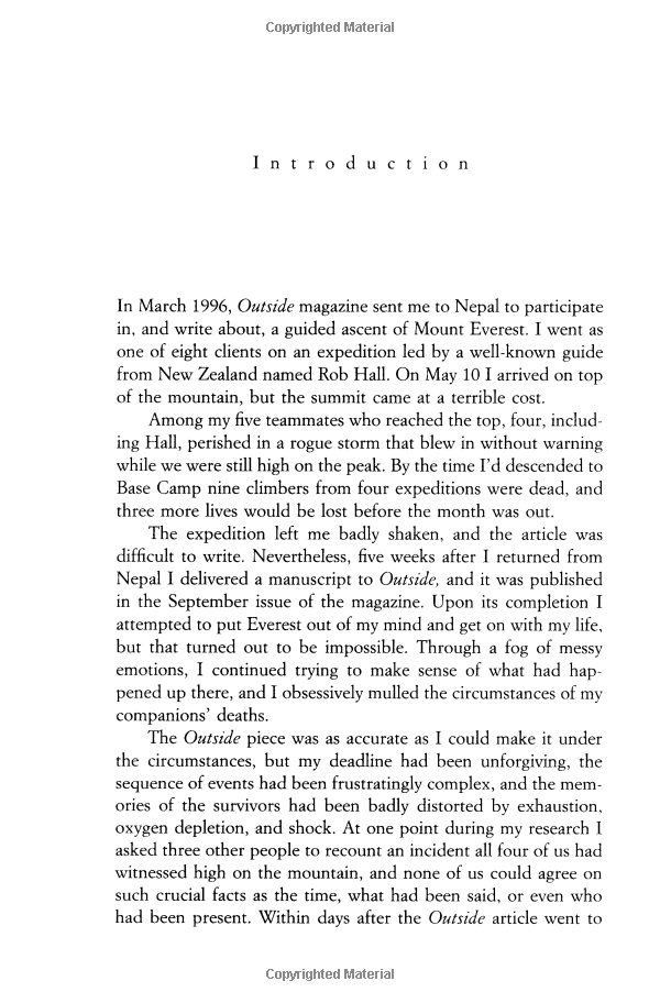 A bank of clouds was assembling on the not-so-distant horizon, but journalist-mountaineer Jon Krakauer, standing on the summit of Mt. Everest, saw nothing that "suggested that a murderous storm was bearing down." He was wrong. The storm, which claimed five lives and left countless more--including Krakauer's--in guilt-ridden disarray, would also provide the impetus for Into Thin Air, Krakauer's epic account of the May 1996 disaster