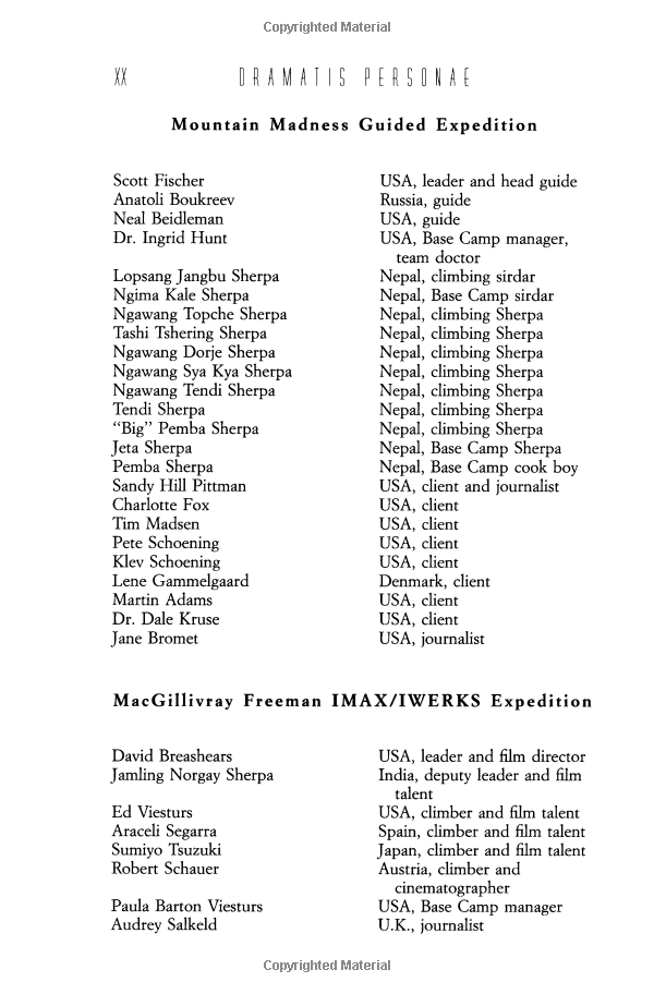 By writing Into Thin Air, Krakauer may have hoped to exorcise some of his own demons and lay to rest some of the painful questions that still surround the event. He takes great pains to provide a balanced picture of the people and events he witnessed and gives due credit to the tireless and dedicated Sherpas. He also avoids blasting easy targets such as Sandy Pittman, the wealthy socialite who brought an espresso maker along on the expedition. Krakauer's highly personal inquiry into the catastrophe provides a great deal of insight into what went wrong. But for Krakauer himself, further interviews and investigations only lead him to the conclusion that his perceived failures were directly responsible for a fellow climber's death. Clearly, Krakauer remains haunted by the disaster, and although he relates a number of incidents in which he acted selflessly and even heroically, he seems unable to view those instances objectively. In the end, despite his evenhanded and even generous! assessment of others' actions, he reserves a full measure of vitriol for himself.