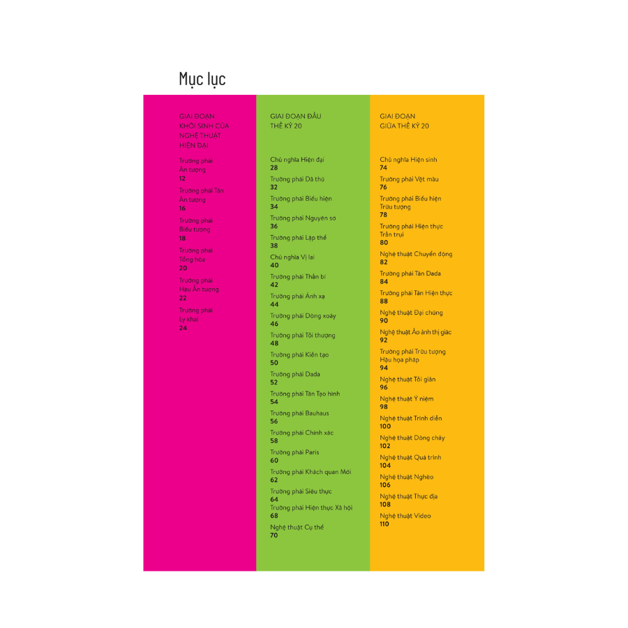 Cuốn sách này là một cẩm nang ngắn gọn giới thiệu cho bạn đọc về 55 trào lưu, trường phái và phong cách thịnh hành từ thời kỳ bình minh hé sáng của nghệ thuật hiện đại cuối thế kỷ 19 cho đến nay, nhằm giúp các bạn làm quen và tiếp cận được một nhánh của dòng chảy lịch sử nghệ thuật.