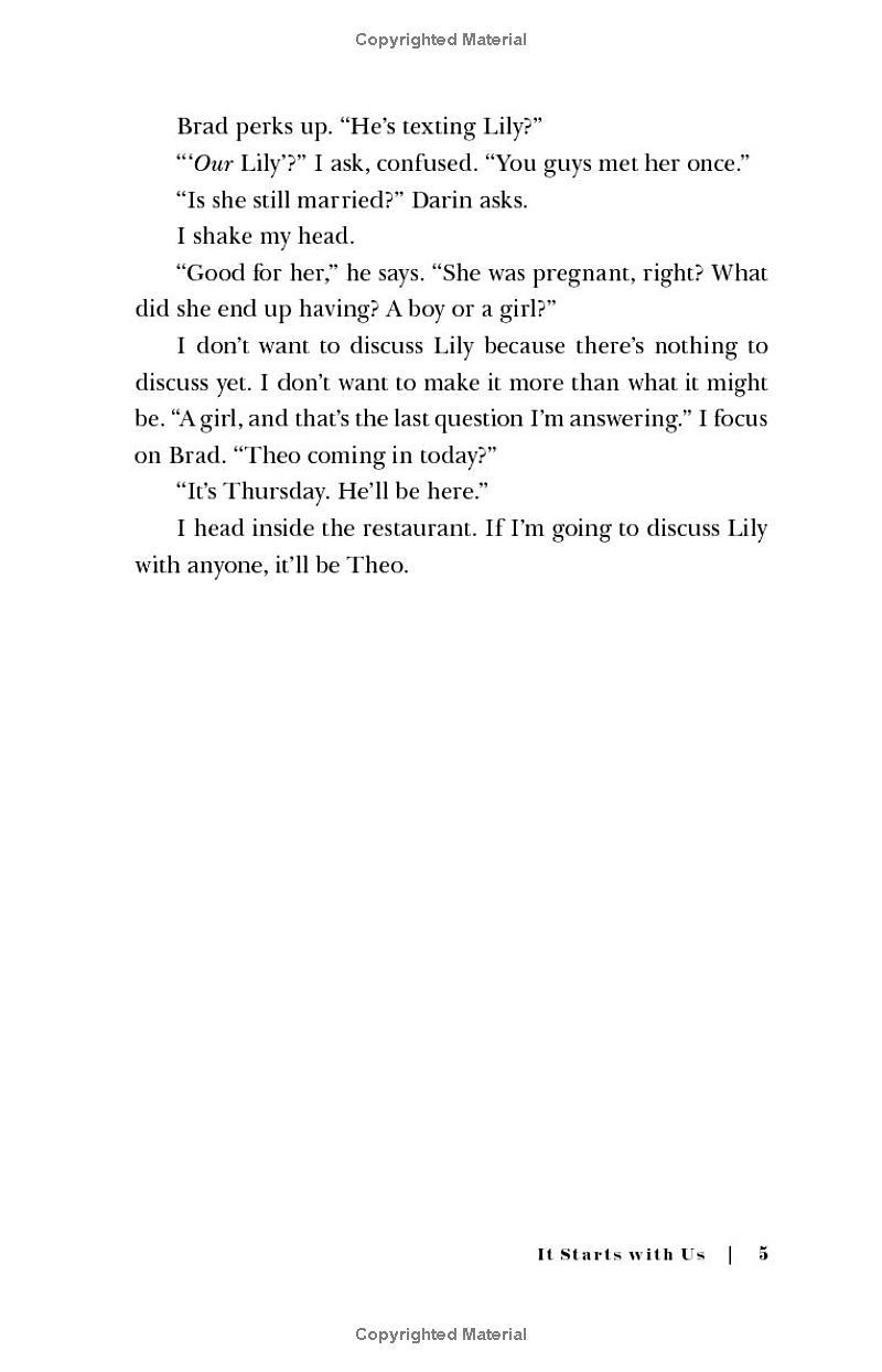 Lily and her ex-husband, Ryle, have just settled into a civil coparenting rhythm when she suddenly bumps into her first love, Atlas, again. After nearly two years separated, she is elated that for once, time is on their side, and she immediately says yes when Atlas asks her on a date.