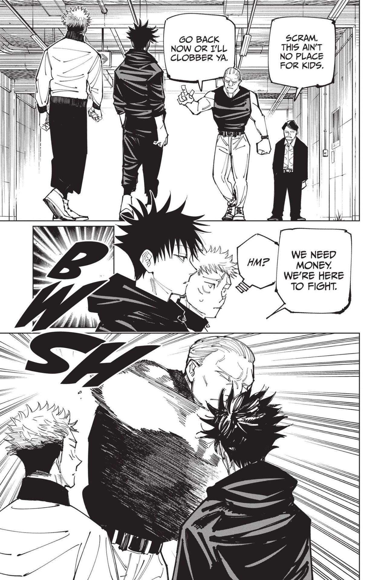 In to thwart the culling game, Itadori needs the help of Kinji Hakari, a third-year who is currently suspended from Jujutsu High, so he decides to participate in an underground fight club where Hakari works as a bookie. Meanwhile, Fushiguro infiltrates the fight club and heads for Hakari’s base of operations, but another Jujutsu High third-year is using their cursed technique to block his way!
