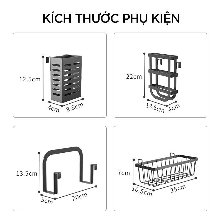 - Bộ sản phẩm đày đủ: Kệ để chén đĩa inox, giá để dao đũa thìa, giá để thớt, giá để nước rửa bát khăn lau bát, 6 móc treo nồi. ƯU ĐIỂM SẢN PHẨM: