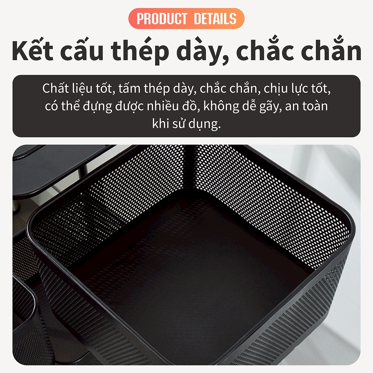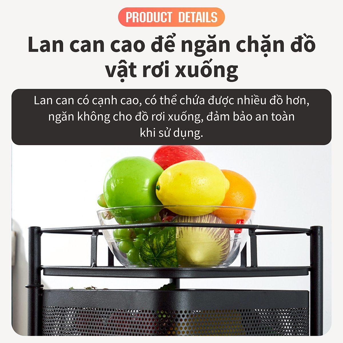 Đầu tiên, thiết kế nhiều tầng xếp chồng lên nhau cung cấp không gian lưu trữ rộng rãi. Các kệ khác nhau có thể được sử dụng để đặt nhiều loại rau củ, trái cây, v.v., giúp bạn phân loại thực phẩm một cách rõ ràng. Cho dù là rau xanh tươi ngon, trái cây mọng nước hay các dụng cụ nhà bếp khác, bạn đều có thể tìm thấy vị trí phù hợp trên giá này.