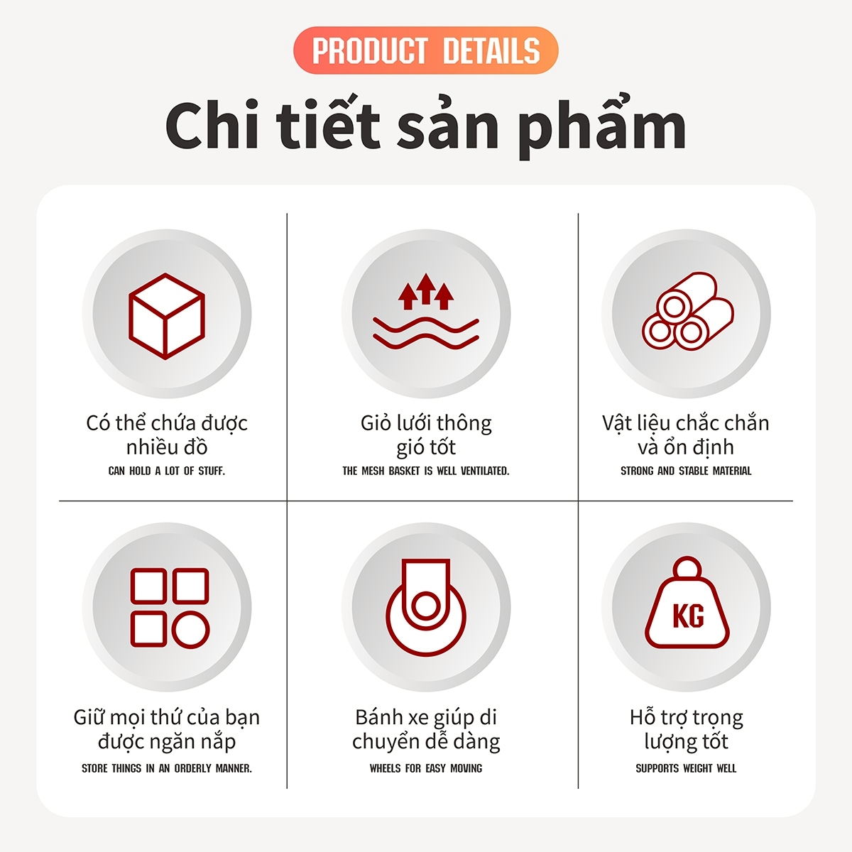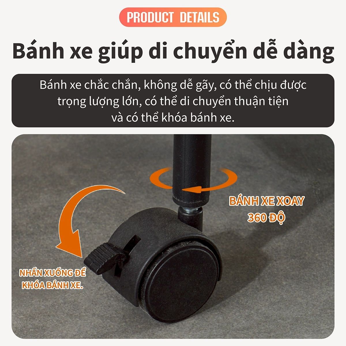 Kệ đựng đồ này được trang bị bánh xe, giúp nó rất linh hoạt. Bạn có thể dễ dàng di chuyển nó đến bất kỳ vị trí nào bạn cần, cho dù là góc bếp, cạnh bồn rửa hay cạnh bàn ăn. Khi bạn cần dọn dẹp nhà bếp, bạn cũng có thể dễ dàng di chuyển nó ra khỏi đường, giúp việc dọn dẹp dễ dàng hơn.