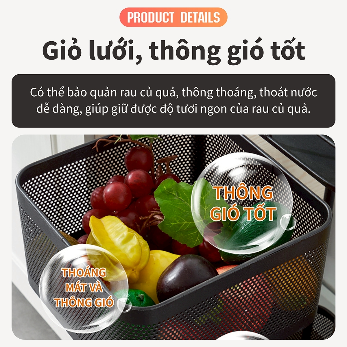 Chiếc giỏ đựng rau củ này được thiết kế đặc biệt dành cho rau củ và trái cây. Nó giúp giữ cho thực phẩm thông thoáng, kéo dài thời gian bảo quản tươi ngon. Đồng thời, khay hứng nước là một điểm cộng rất tiện lợi. Sau khi rửa sạch rau củ hoặc trái cây, bạn có thể đặt trực tiếp lên giá để ráo nước, tránh tình trạng đọng nước, giữ cho nhà bếp khô ráo và gọn gàng.