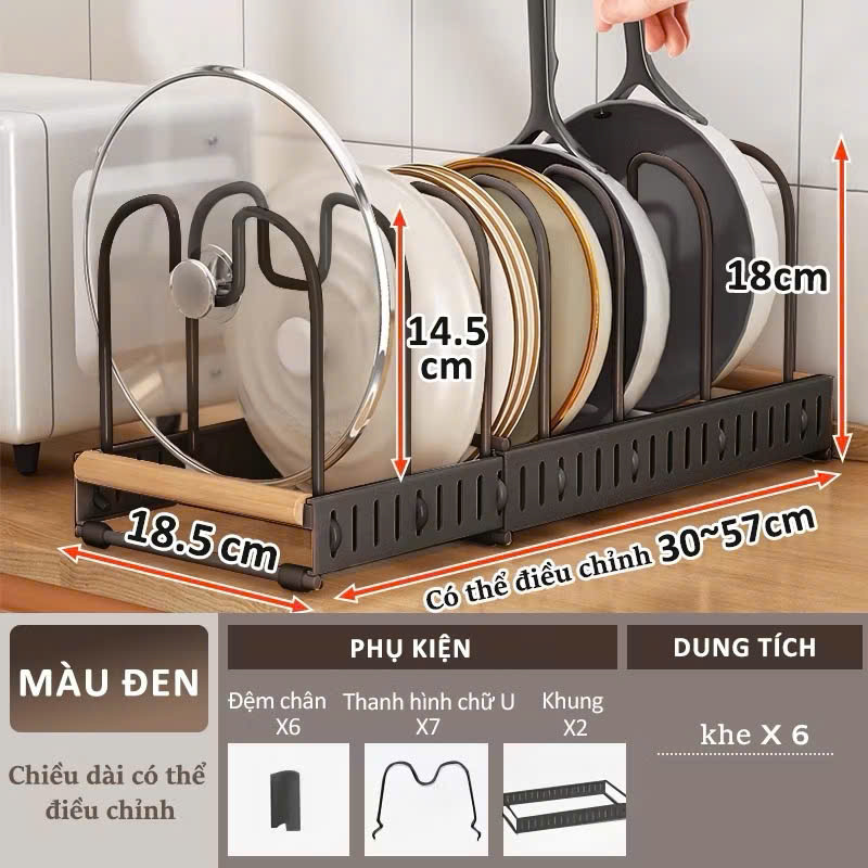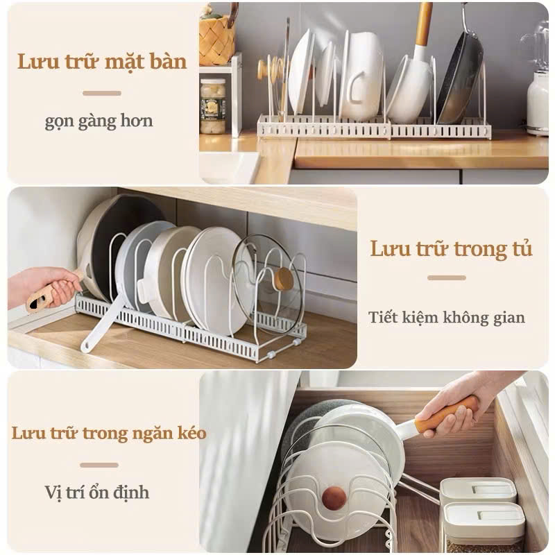 - Chức năng: Giá úp nồi chảo, tiết kiệm không gian, có thể điều chỉnh độ dài