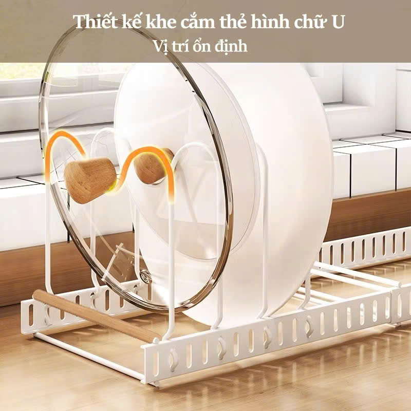- Thiết Kế Đa Năng: Kệ được thiết kế để phù hợp với nhiều loại nồi, chảo, giúp bạn dễ dàng sắp xếp các dụng cụ nhà bếp một cách ngăn nắp. Với khả năng điều chỉnh độ dài, kệ có thể mở rộng hoặc thu hẹp tùy vào nhu cầu sử dụng, giúp bạn tiết kiệm không gian một cách tối đa.