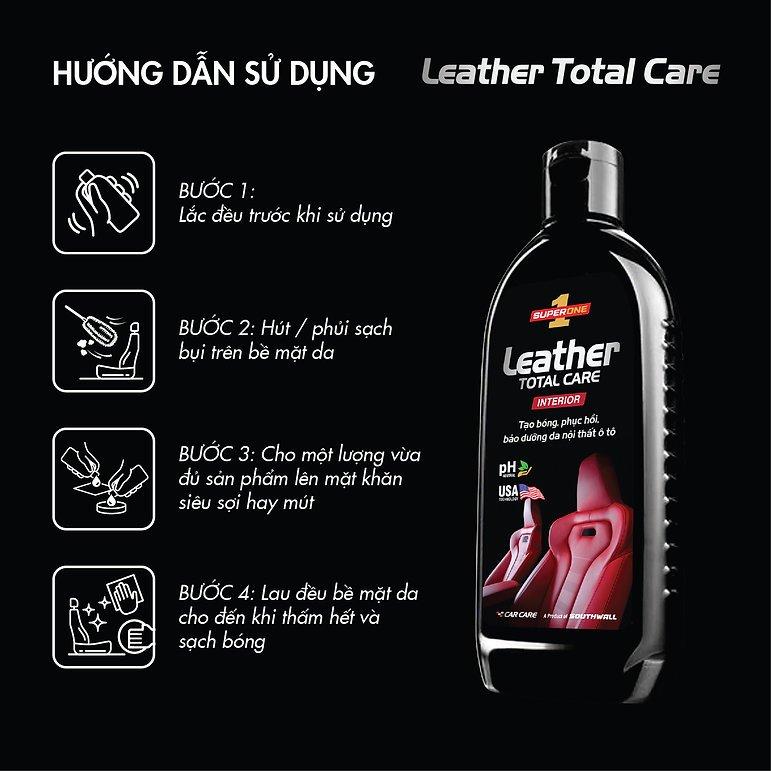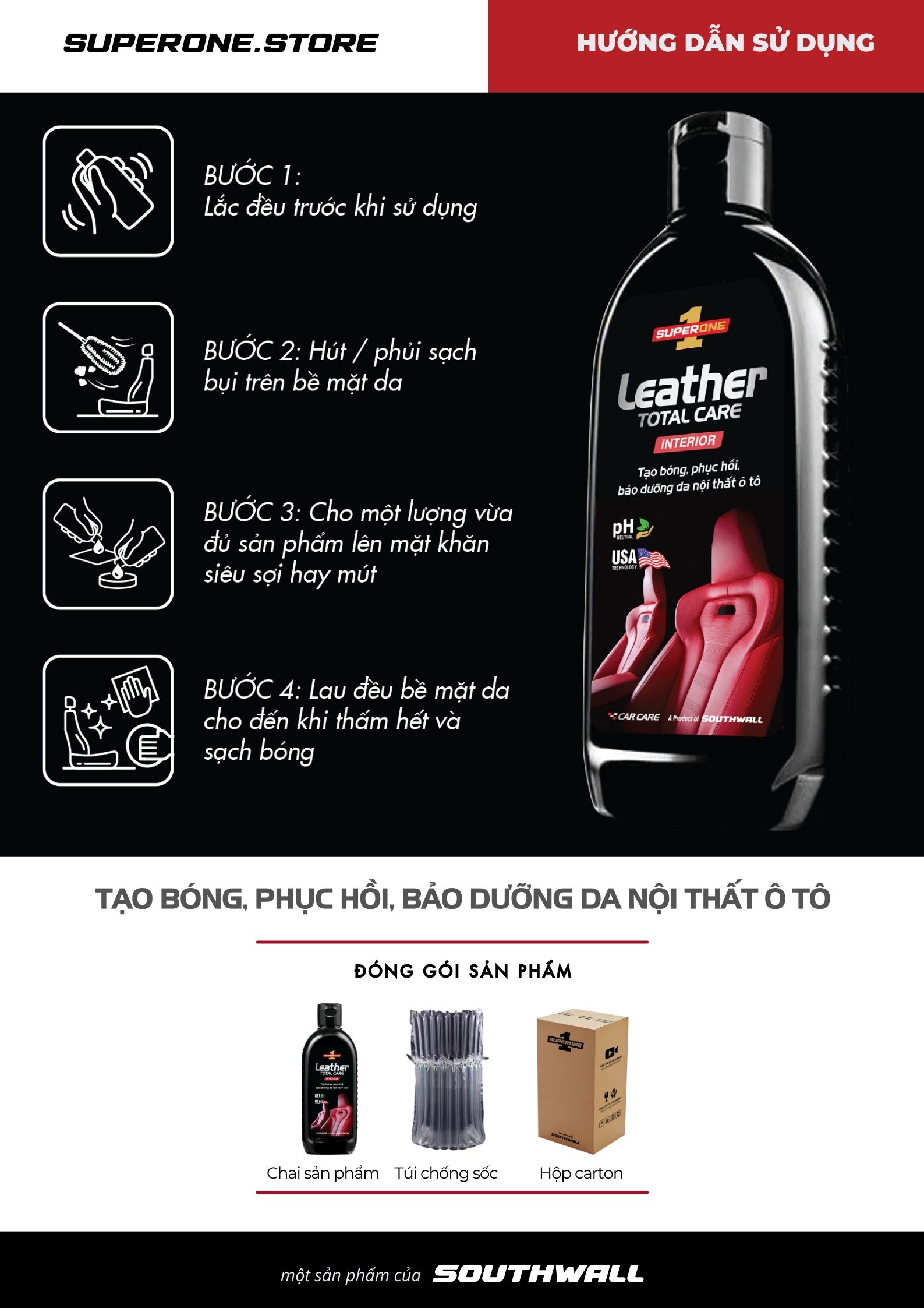 Kem Chăm Sóc Da Nội Thất Toàn Diện Super One Leather Total Care – Interior là sản phẩm chăm sóc da nội thất ô tô cao cấp, chuyên dụng cho da và da tổng hợp. Với công thức độc đáo, sản phẩm giúp tạo độ bóng, mịn tự nhiên cho da, đồng thời nhẹ nhàng làm sạch và giữ cho bề mặt da luôn như mới. Kem còn giúp phục hồi cảm giác mềm mại của bề mặt da, chống lão hóa, nứt nẻ và bảo vệ da lâu dài. Sản phẩm có cách sử dụng đơn giản, hiệu quả tức thì và duy trì lâu lâu. Sau khi sử dụng, bề mặt da sẽ sáng bóng, mịn màng và mềm mại hơn, mang lại cảm giác sang trọng và đẳng cấp cho nội thất ô tô.