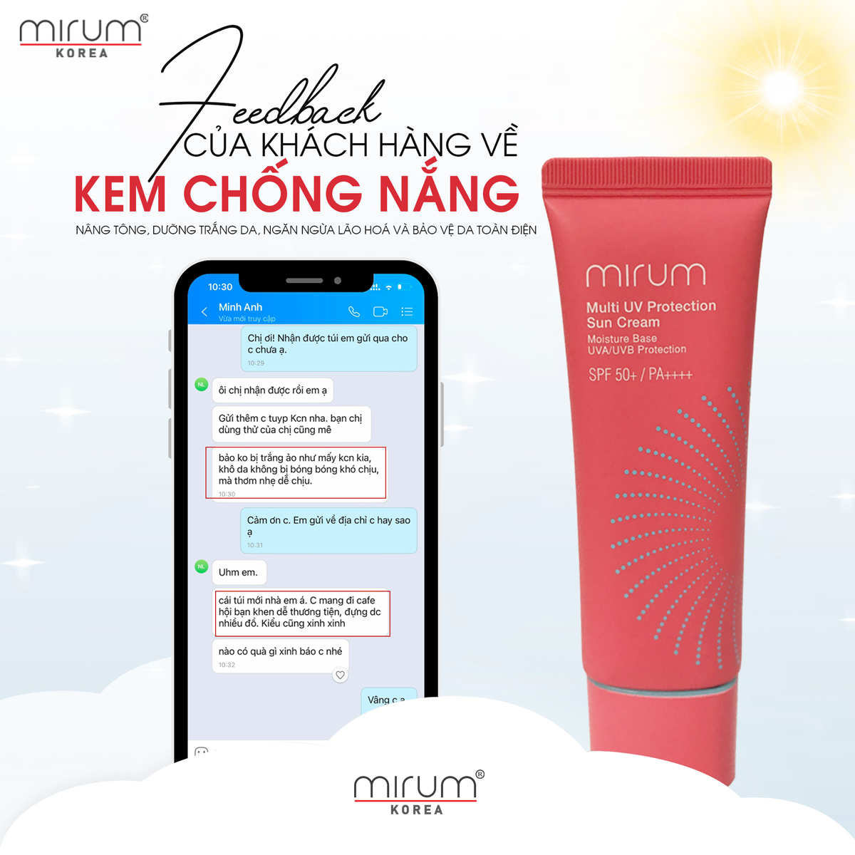 Cảm ơn quý khách đã tin tưởng và lựa chọn sản phẩm Kem chống nắng nâng tông, dưỡng trắng, ngừa lão hóa và bảo vệ da toàn diện Mirum 50ml của chúng tôi. Nếu có bất kỳ thắc mắc về sản phẩm, vui lòng liên hệ ngay với chúng tôi. Chúng tôi luôn ở đây và sẵn sàng giải đáp cho bạn!