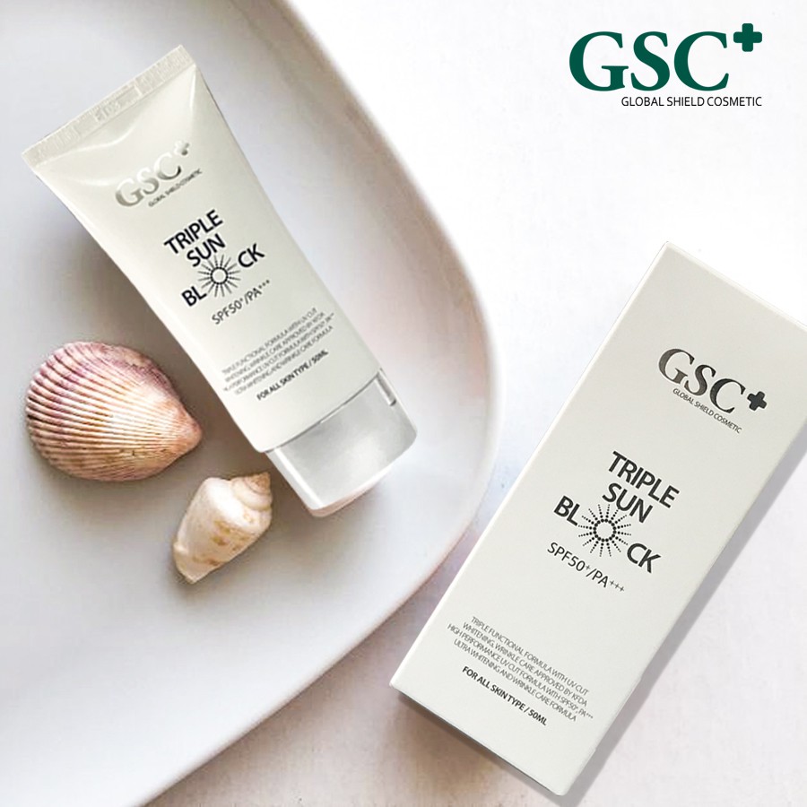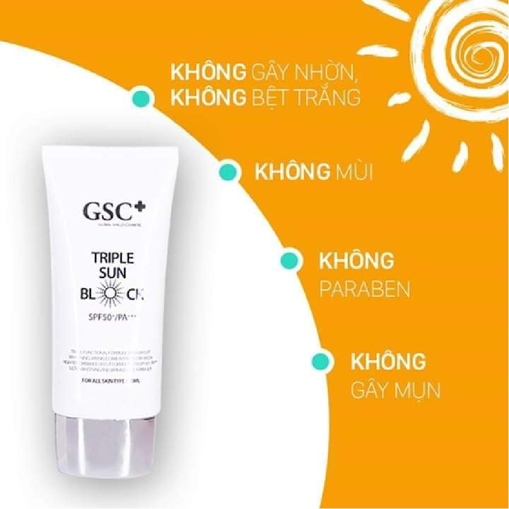 - TRIPLE SUN BLOCK 50g Kem chống nắng GSC Triple Sun Block Hàn Quốc là một trong những sản phẩm kem chống nắng vật lý. Sản phẩm được chị em phụ nữ tin dùng nhiều nhất tại Việt Nam. Kem chống nắng chứa thành phần lành tính và chỉ số chống nắng cao. Giúp bảo vệ làn da khỏi tác hại của các tia UVA/UVB, chống lão hóa. Phù hợp với mọi loại da, kể cả da nhạy cảm