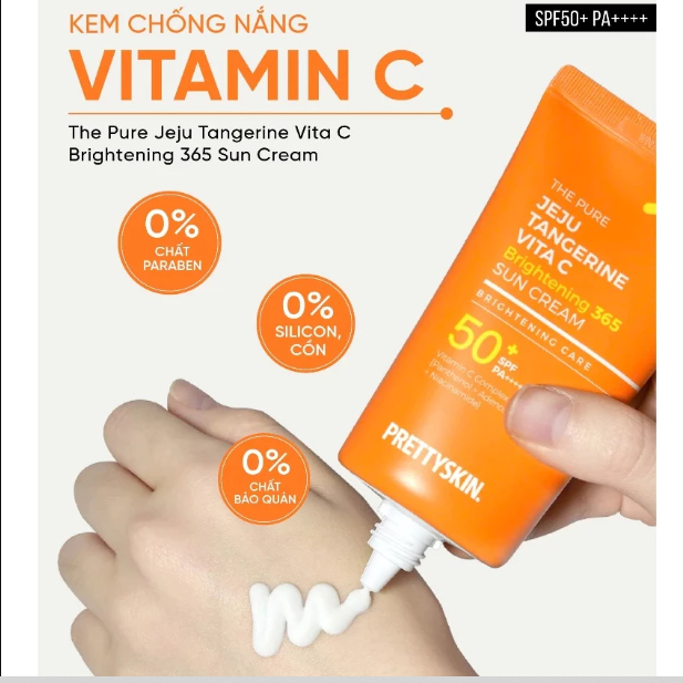 Kem chống nắng Pretty Skin Jeju Vita C Brightening 365 Sun Cream kết hợp 2 trong 1 vừa dưỡng trắng da vừa bảo vệ toàn diện với chỉ số SPF50+, PA++++ chống lại tia UVA, UVB và ánh sáng xanh