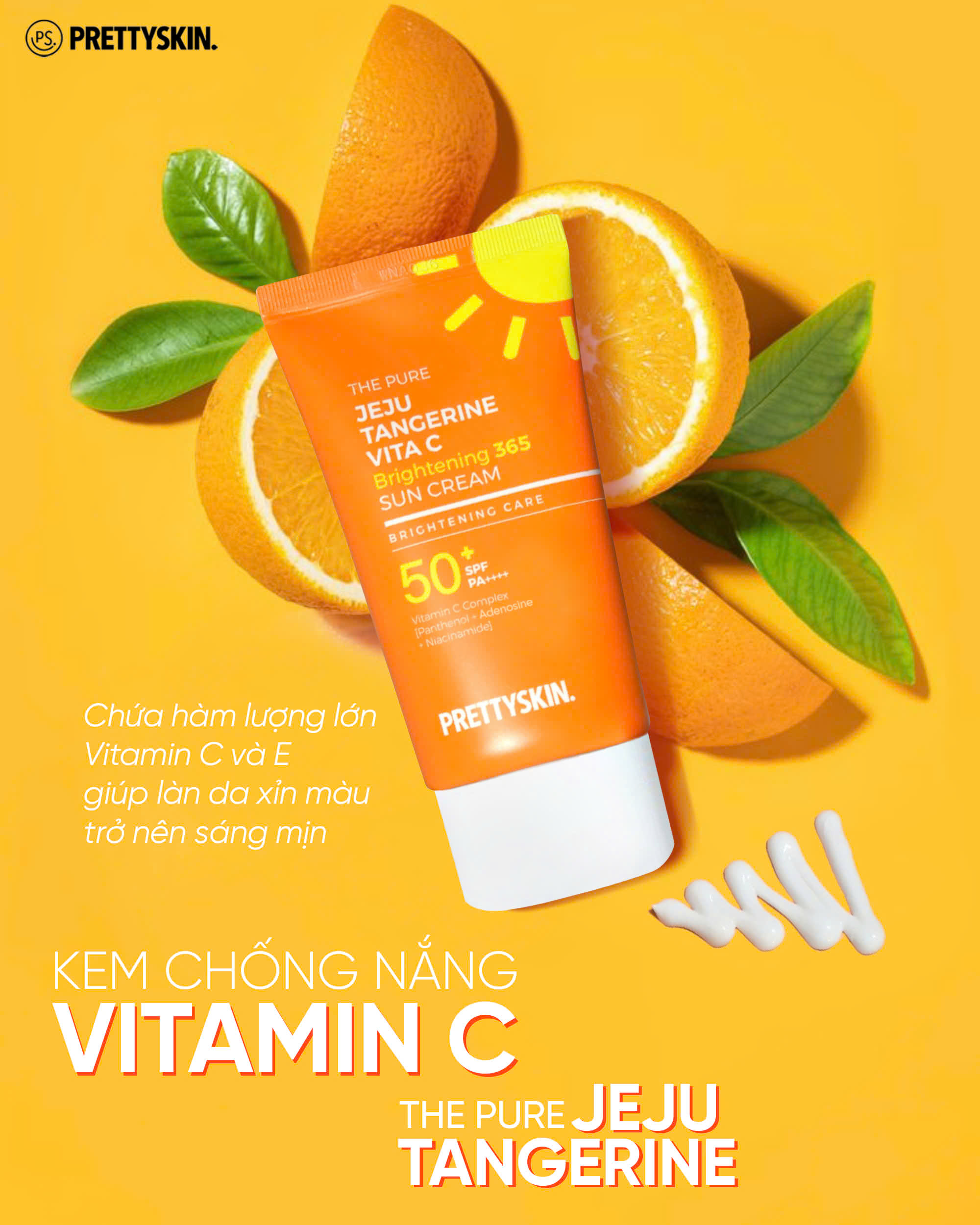 – Kem chống nắng Pretty Skin Vita C được chiết xuất từ quả quýt đỏ căng mọng trên đảo Jeju giàu vitamin C, giúp làm mờ thâm, đều màu da, tăng cường sức sống.