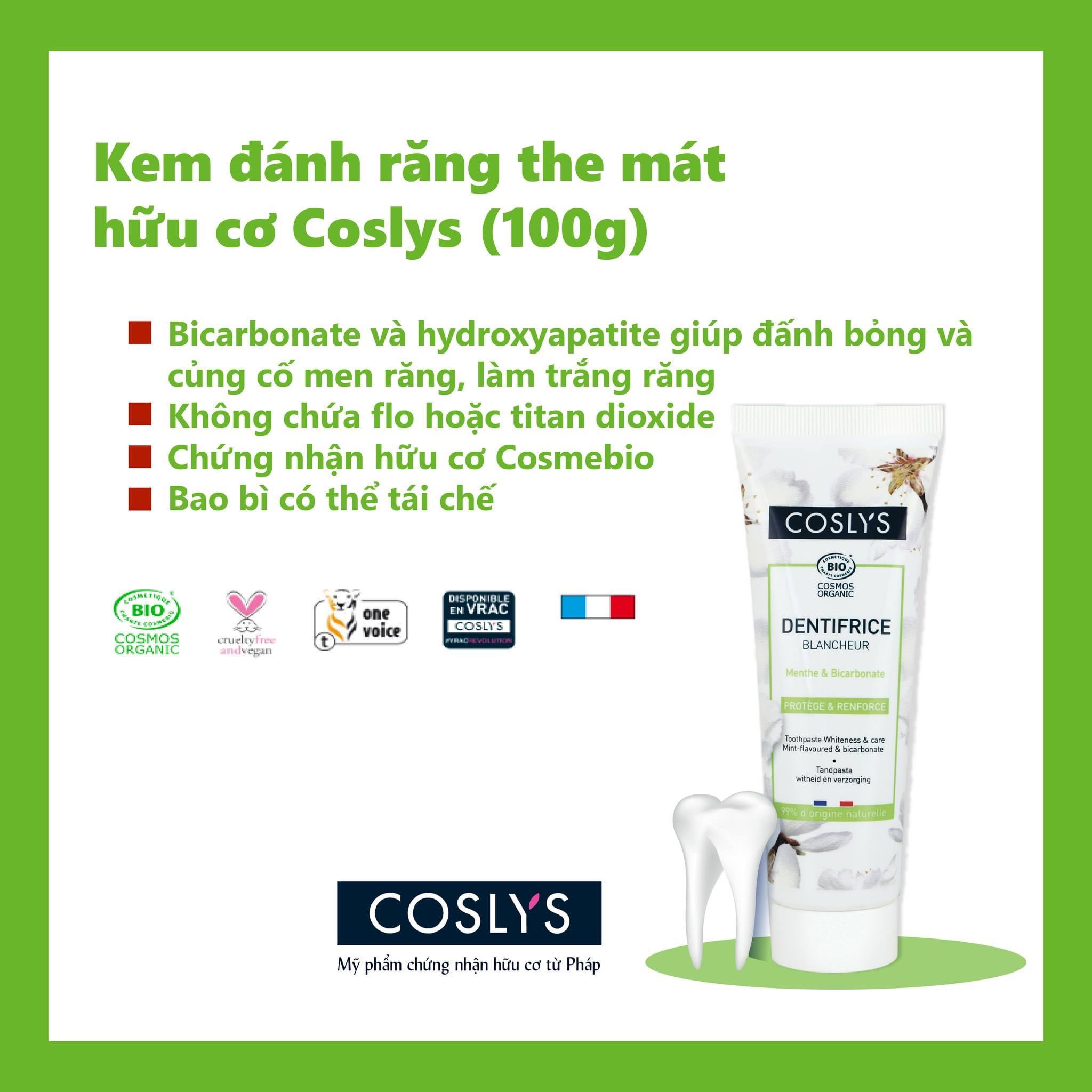 Mua tại TiktokChứng nhận hữu cơ Ecocert Chứng nhận Hữu cơ bởi Cosmos Organic ️Thương hiệu: Coslys - Pháp Kem đánh răng hữu cơ làm trắng răng hương hoa Coslys với mùi hương hoa cỏ ngọt, thành phần được làm giàu với bicarbonate và lô hội sẽ nhẹ nhàng đánh bóng răng, đồng thời củng cố men răng.