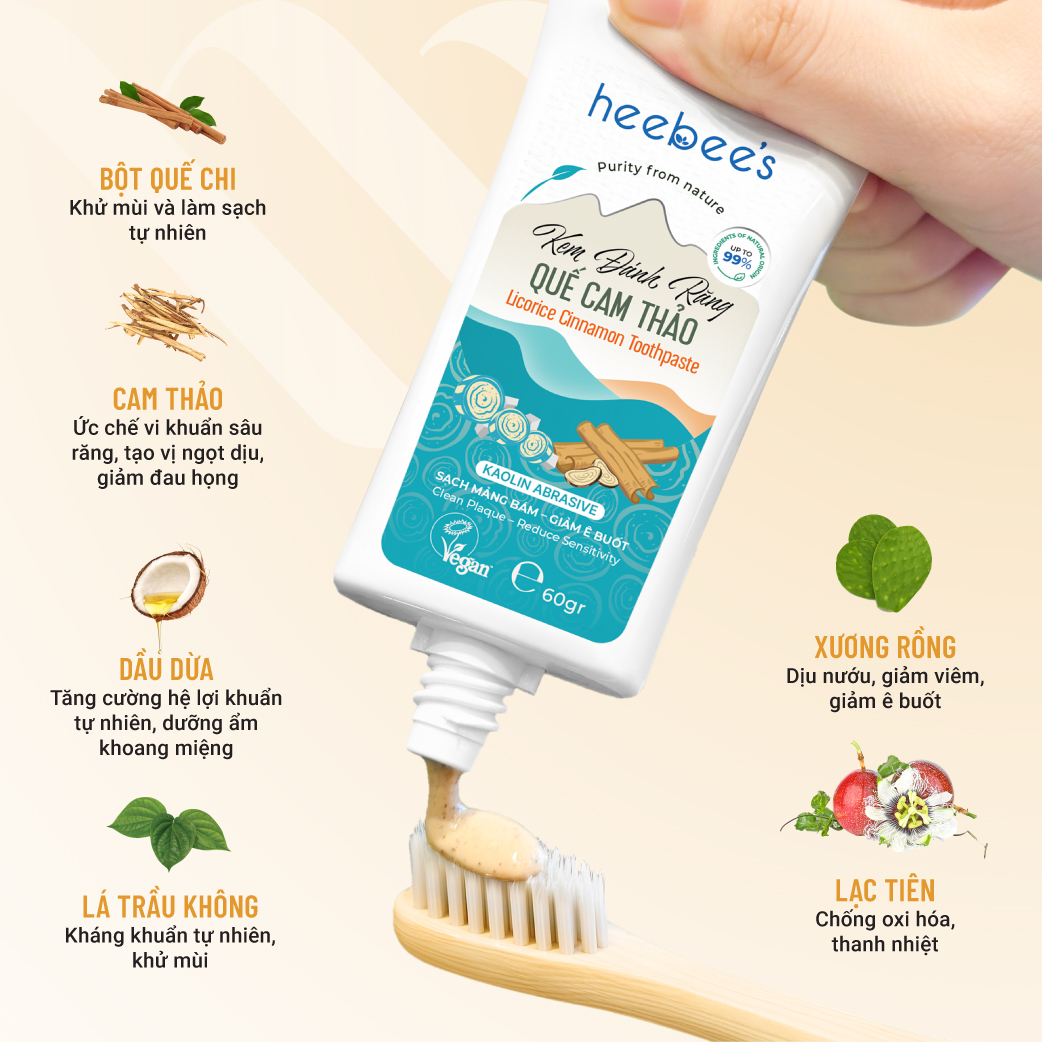 Kem Đánh Răng Thảo Dược Thuần Chay Quế Cam Thảo - Sạch Mảng Bám, Giảm Ê Buốt 60 Gram ĐIỂM NỔI BẬT Kem đánh răng Quế Cam Thảo là sự kết hợp tiên phong giữa Kaolin nguyên khoáng, Cam Thảo ấm dịu và Bột Quế Chi nồng nàn. Không chỉ thanh lọc và làm sạch nhẹ nhàng, công thức còn nuôi dưỡng khoang miệng bằng thảo dược thuần chay, nâng niu từng chiếc răng nhạy cảm với độ pH lý tưởng và thành phần giàu hoạt chất kháng viêm – giúp bạn khởi đầu ngày mới bằng hơi thở thơm mát, và nụ cười êm dịu, khỏe khoắn từ sâu bên trong. THÀNH PHẦN CHÍNH ĐIỀU GÌ KHIẾN KEM ĐÁNH RĂNG THẢO DƯỢC QUẾ CAM THẢO HEEBEE'S KHÁC BIỆT? CAM KẾT SẢN PHẨM CÔNG DỤNG ‣ Làm sạch cao răng và mảng bám trên răng ‣ Giảm tình trạng ê buốt và viêm nướu ‣ Giảm mùi hôi khoang miệng, hơi thở thơm mát dài lâu ‣ Ngăn ngừa sâu răng, bảo vệ răng nướu chắc khỏe mỗi ngày ĐỐI TƯỢNG SỬ DỤNG ‣ Phù hợp cho mọi lứa tuổi và đối tượng ‣ Thích hợp cho các tình trạng răng nhạy cảm và ê buốt ‣ An toàn cho thai phụ và trẻ nhỏ ‣ Trẻ em dưới 6 tuổi chỉ nên sử dụng một lượng kem tương đương với kích thước của một hạt đậu và cần được người lớn giám sát để tránh nuốt phải sản phẩm CÁCH SỬ DỤNG ‣ Lấy một lượng kem vừa đủ ‣ Súc miệng nhẹ để làm ẩm khoang miệng và loại bỏ mảng bám lớn ‣ Chải răng nhẹ nhàng, đều tay trên toàn bộ bề mặt răng, theo đúng hướng dẫn của Nha sĩ ‣ Súc miệng lại với nước Để hiệu quả làm sạch x2 và hơi thở luôn thơm mát, khuyến khích dùng Nước Súc Miệng Thảo Dược Thuần Chay Đinh Hương Heebee’s HƯỚNG DẪN BẢO QUẢN ‣ Bảo quản nơi khô ráo, thoáng mát, tránh ánh nắng trực tiếp và nhiệt độ cao ‣ Đậy nắp kín sau khi sử dụng THÀNH PHẦN CHI TIẾT Water, Sorbitol, Kaolin (20%), Glycyrrhiza Uralensis Root Extract, Glycerin, Decyl Glucoside, Propanediol, Cocos Nucifera Oil, Isosorbide, Cinnamomum Zeylanicum Bark Powder, Piper Betle Leaf Extract, Opuntia Ficus-Indica Extract, Phenoxyethanol, Menthol, Glycolipids, Carbomer, Passiflora Laurifolia Flower Extract, Xanthan Gum, Ethylhexylglycerin, Triethanolamine.