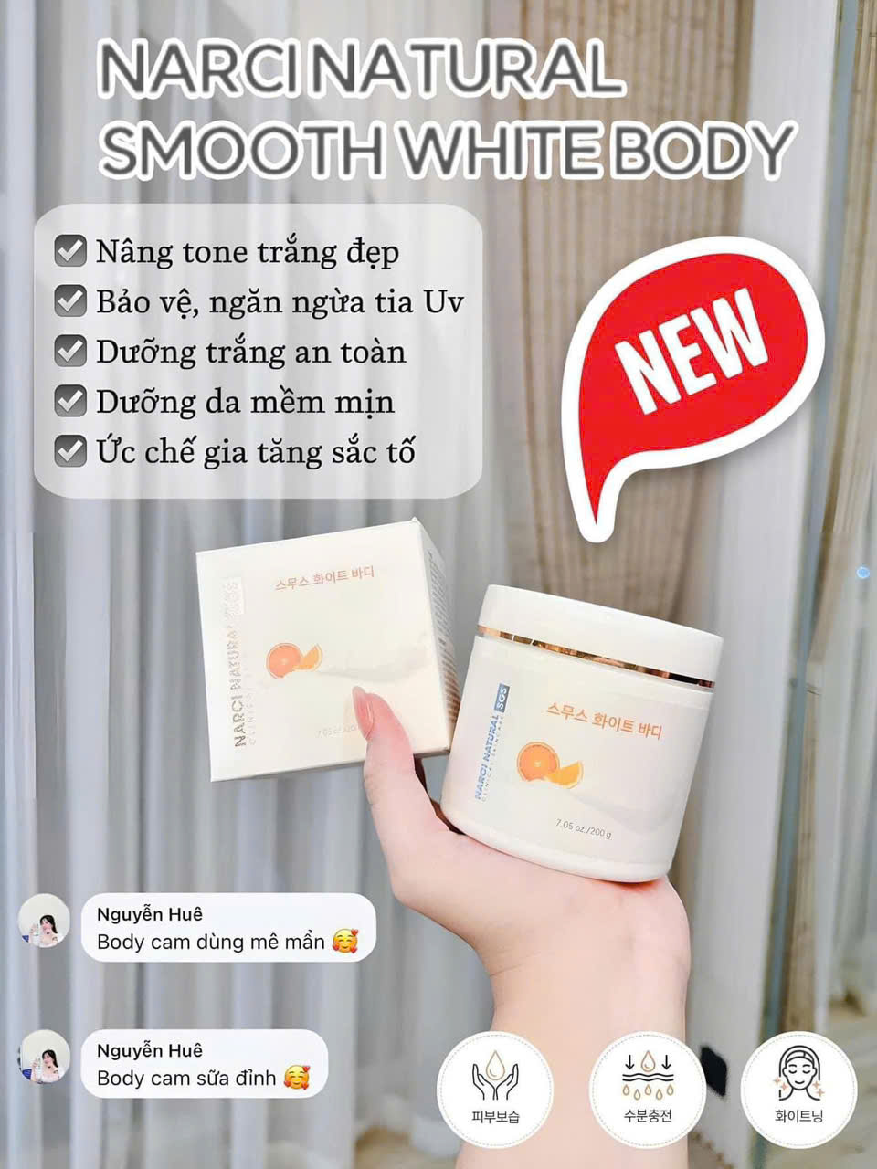 ✨Kem Dưỡng Trắng Da Body Narci Natural Smooth White Body 200g hạn 2027