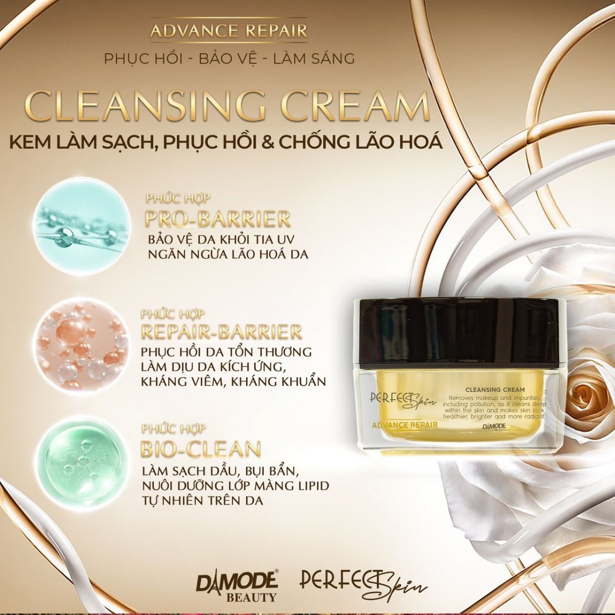 - Công dụng: Kem làm sạch sâu bụi bẩn, bả nhờn, lớp trang điểm, phục hồi hàng rào lipit bảo vệ da, chống lão hoá da. Cleansing Cream là dòng kem làm sạch da đang được đông đảo chị em lựa chọn. Sản phẩm không chỉ hỗ trợ làm sạch da, loại bỏ bụi bẩn và các lớp makeup mà còn chăm sóc và phục hồi làn da hiệu quả. Cùng Damode tìm hiểu chi tiết hơn về dòng sản phẩm này ngay sau đây nhé. Giới thiệu về sản phẩm Cleansing Cream Cleansing Cream là kem tẩy trang làm sạch da quen thuộc đối với các tín đồ chăm sóc sắc đẹp. Sản phẩm được ứng dụng công nghệ độc quyền cùng với các thành phần tự nhiên cho khả năng làm sạch da an toàn và hiệu quả. Hiệu quả bất ngờ từ Cleansing Cream chỉ sau 2 tuần sử dụng Trong các sản phẩm làm sạch da, Cleansing Cream được Damode phân phối rất phổ biến trên thị trường và nhận lại các phản hồi tích cực. Sản phẩm với công thức 20 – 10 – 5 – 3 giúp không chỉ làm sạch mà còn bảo vệ làn da của bạn hiệu quả. Cụ thể: