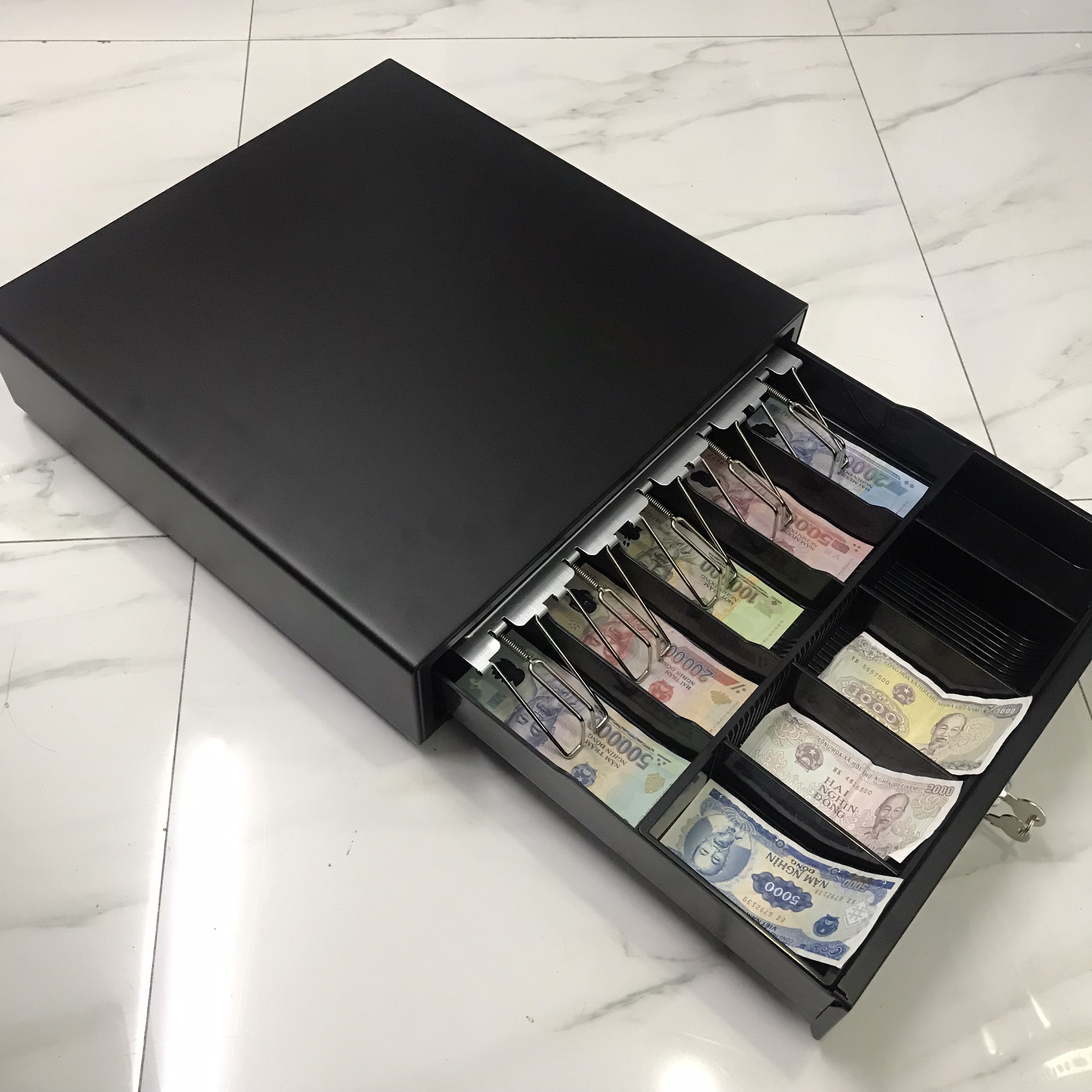 -Size: 41 x 42 x 10 cm -Trọng lượng : 7,8 Kg - ngăn kéo đựng tiền : 5 ngăn giấy có kẹp và 5 ngăn giấy không kẹp - Kiểu mở: Ra phía trước - Kết