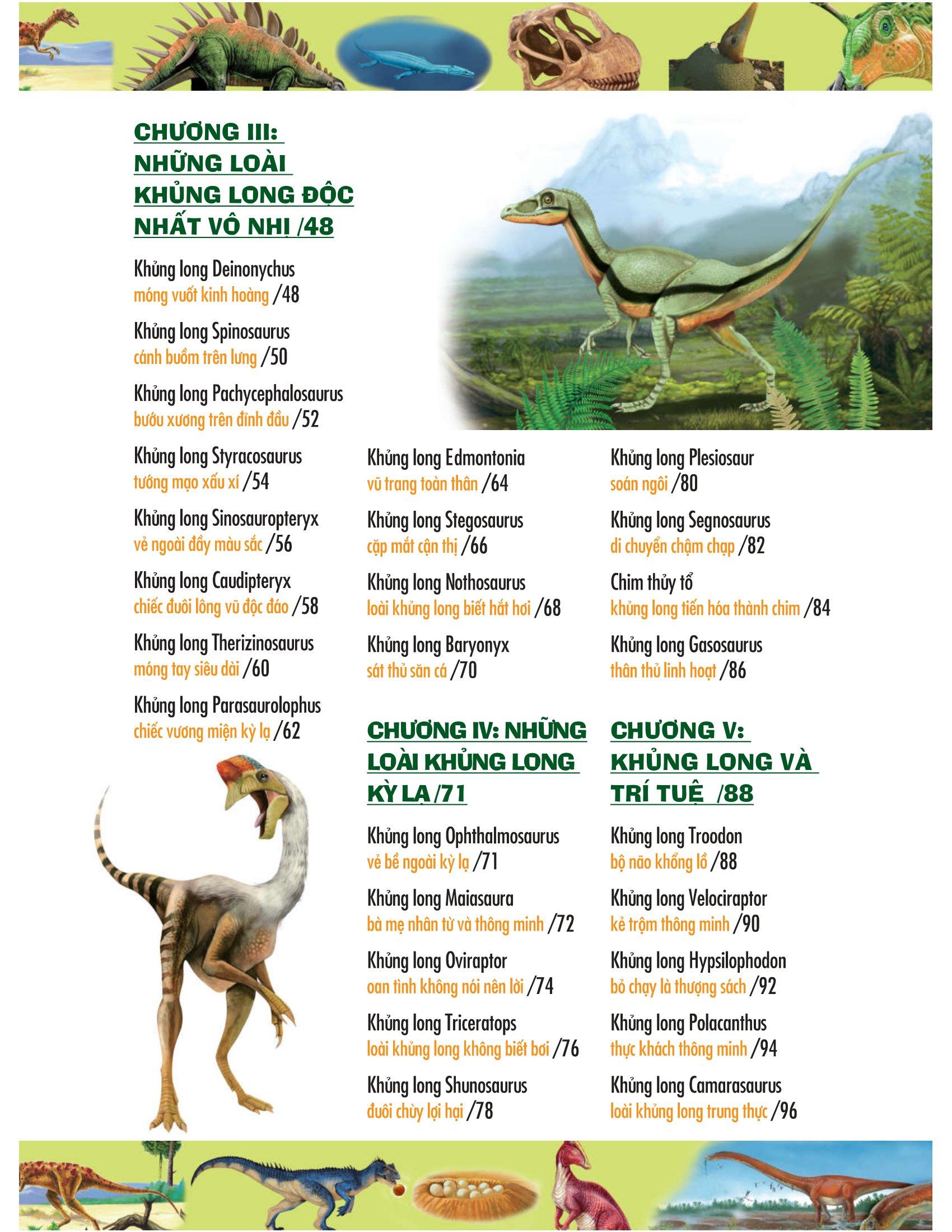 Cuốn sách có sử dụng nhiều hình ảnh chọn lọc, lựa chọn giới thiệu hình thái bên ngoài và những khả năng đặc biệt của những loài khủng long tiêu biểu, khiến độc giả trẻ tuổi có thể thư giãn mà vẫn thu được nhiều kiến thức hữu ích. Nếu bạn yêu thích khủng long, thì đây là cuốn sách hay và bổ ích không thể bỏ lỡ.