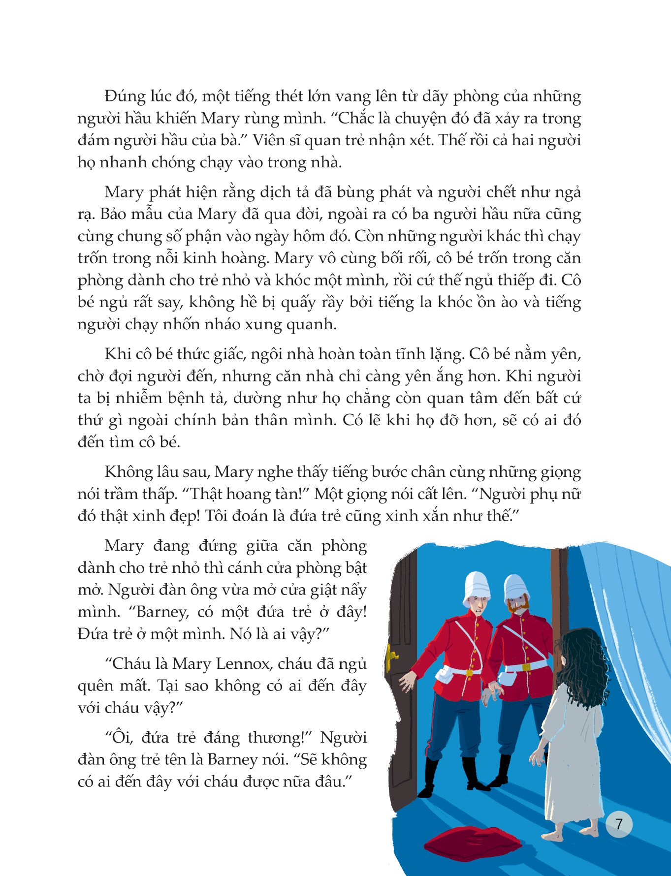 Mọi người đều nói Mary Lennox có vẻ ngoài chẳng ai ưa nổi, cái mặt gầy choắt còn biểu cảm thì cau có, khó gần. Mary sinh ra ở Ấn Độ. Cha của cô bé làm việc cho chính phủ Anh, còn mẹ cô bé là một phụ nữ vô cùng xinh đẹp, có điều dường như họ chẳng hề bận tâm đến việc nuôi dạy đứa con gái nhỏ của mình. Lúc nào Mary cũng ở cùng bảo mẫu và bị tách xa khỏi cha mẹ hết mức có thể. Mẹ của Mary không thích nghe thấy tiếng khóc của con gái mình, cho nên những người hầu trong nhà luôn cố gắng chiều theo mọi yêu cầu của cô bé. Bởi thế mà chẳng có gì đáng ngạc nhiên khi lớn lên, cô bé lại trở thành một đứa trẻ ích kỷ.