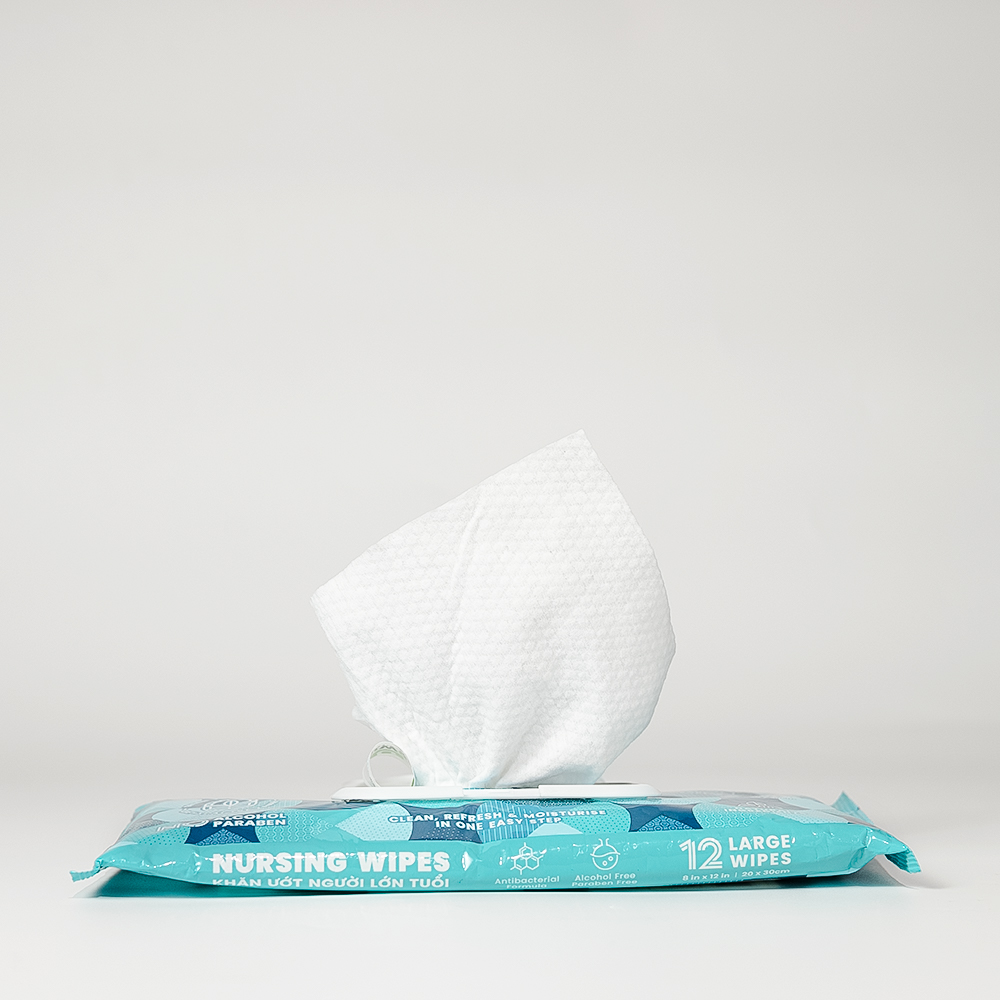 ✨Khăn giấy ướt vệ sinh cơ thể NursingWipes gói 12 khăn size lớn 30x20cm hương trà xanh lau người lớn tuổi, người bệnh, người đi phượt dùng 1 lần