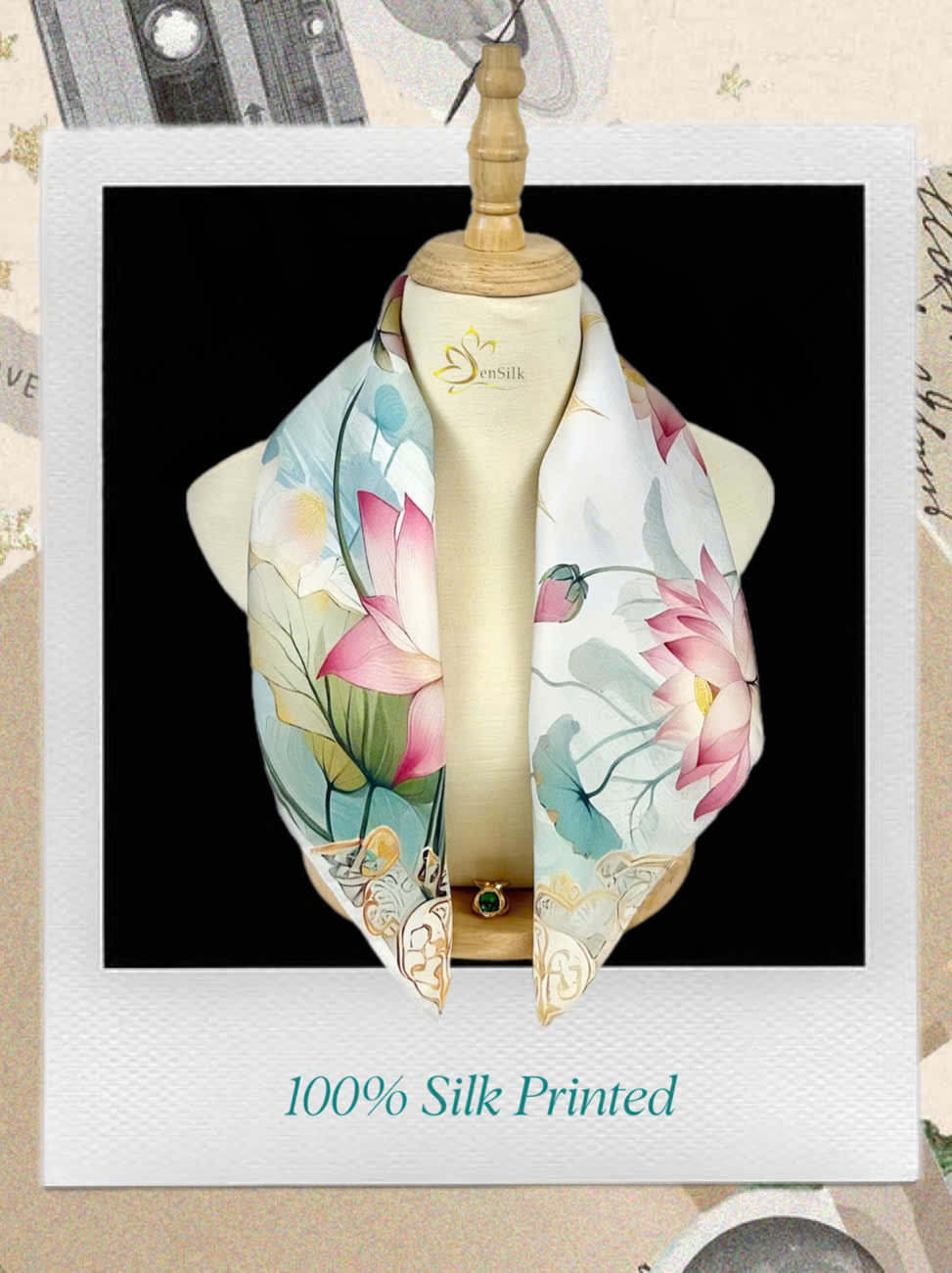 ✨Khăn Lụa in Độc Bản Sen Mặt Trời 65x65cm - Mulberry Silk Gift - Square Towel 65x65 - Quà Tặng Lụa Cao Cấp