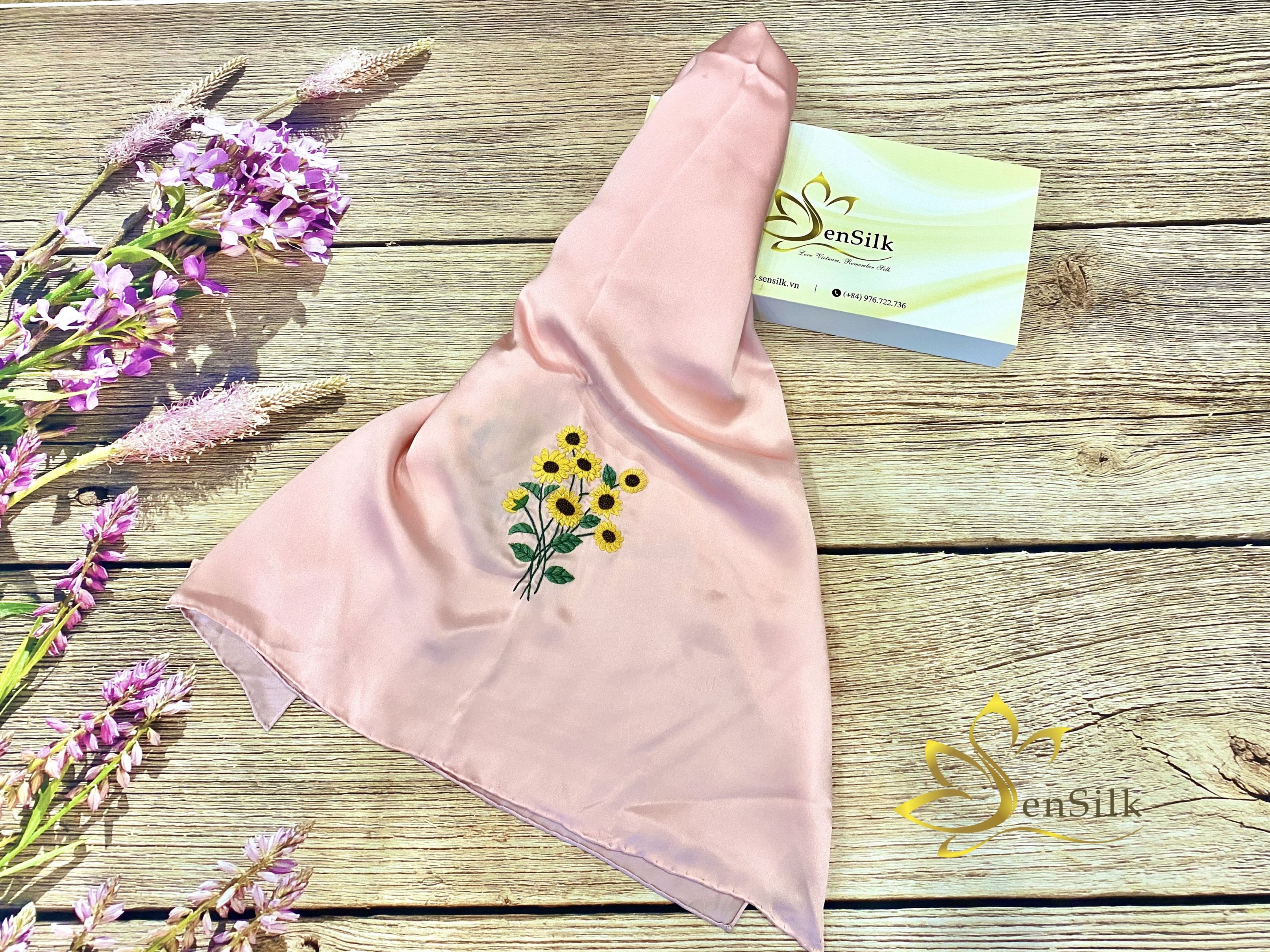 Khăn Lụa Thêu Hoa Hướng Dương SenSilk loài hoa tình yêu luôn hướng về phía mặt trời nên thường là biểu tượng của lòng trung thành, chung thủy sâu sắc, sự kiên định đó cũng biểu thị cho sức mạnh, uy quyền, sự ấm áp…