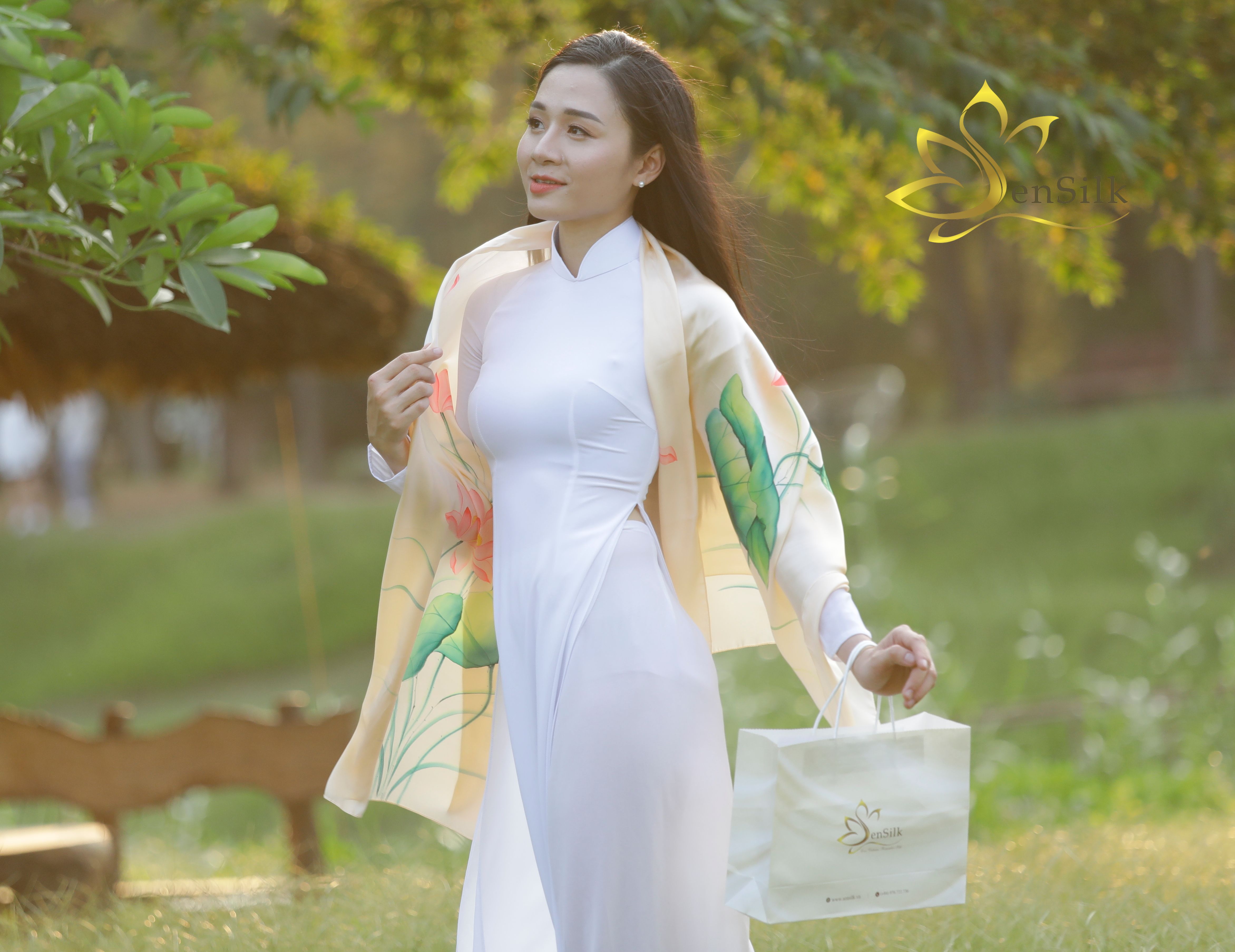 - Đóng gói: bộ sản phẩm đầy đủ gồm khăn, hộp, thiệp và túi giấy handmade Do đó, Khăn Lụa Vẽ Tay SenSilk Limited – Silk Painting Scarves là món quà tặng tình yêu hoàn hảo giúp bạn gửi gắm tình cảm, lời chúc sức khỏe, thịnh vượng và may mắn tới người thân, quà tặng doanh nhân, quà tặng cao cấp… Khăn Lụa Tơ Tằm Vẽ Tay SenSilk Limited là tác phẩm nghệ thuật có 1 không 2 về tình yêu được nghệ nhân vẽ tay trên nền Lụa tơ tằm Bảo Lộc cao cấp– nơi được mệnh danh “Thủ phủ dâu tằm tơ Việt Nam” từ lâu đã nổi tiếng với nghề trồng dâu, nuôi tằm và dệt lụa. Tơ lụa Bảo Lộc tự nhiên có độ mềm mại, bóng, xốp, cho người dùng cảm nhận rõ rệt vẻ mượt mà và êm ái; đặc biệt ấm áp khi đông sang, mát mẻ khi hè về. Thiết kế tối giản, không thêm thắt, nhấn nhá thêm bất kỳ chi tiết nào, chiếc khăn trơn tôn vinh lên vẻ đẹp óng mượt, mềm mại, quyến rũ của lụa tơ tằm tự nhiên. Không cầu kỳ hoa lá, không muôn hình muôn vẻ nhưng cái đẹp mà chiếc Khăn lụa trơn với gam màu rất đỗi ngọt ngào, tươi sáng mang lại cũng có thể khiến bạn cảm nhận được sức sống căng tràn. Được tô điểm bởi những cánh sen hồng, nhánh mai vàng, sắc đào xuân hay sắc hoa hồng phấn…. dưới bàn tay tỉ mỉ của nghệ nhân làng nghề đã biến chiếc khăn lụa vốn đã mềm mại càng thêm phần tinh tế, độc đáo, duy nhất! Với kỹ thuật may rua và vẽ tay hoàn toàn thủ công, mỗi chiếc khăn là một tác phẩm nghệ thuật vô cùng đẹp mắt và tinh tế cực kỳ phù hợp quà tặng đẳng cấp cho đối tác, khách nước ngoài và chứa chan ân tình trao người thương. Trong tiết trời hơi se lạnh của mùa Thu – Đông – Xuân, nàng đừng quên khoác nhẹ lên bờ vai chiếc Khăn lụa dài hồng trơn mượt mà. Không những giúp giữ ấm đôi vai mà đó còn là món phụ kiện làm tôn lên vẻ đẹp dịu dàng đầy thi vị của người phụ nữ Á Đông. Lụa tơ tằm cao cấp SenSilk là dòng sản phẩm từ 100% lụa tơ tằm Bảo Lộc – nơi được mệnh danh “Thủ phủ dâu tằm tơ Việt Nam” từ lâu đã nổi tiếng với nghề trồng dâu, nuôi tằm và dệt lụa.Tơ lụa Bảo Lộc tự nhiên có độ mềm mại, bóng, xốp, cho người dùng cảm nhận rõ rệt vẻ mượt mà và êm ái; đặc biệt ấm áp khi đông sang, mát mẻ khi hè về. Vì vậy, Khăn Lụa Tơ Tằm Vẽ Tay SenSilk Limited – Silk Painting quả là món quà vô giá từ làng nghề truyền thống Việt Nam giành để trao tặng người thân, quà tặng doanh nghiệp, quà tặng đối tác , quà tri ân … hay Quà cho người nước ngoài! HƯỚNG DẪN SỬ DỤNG KHĂN LỤA TƠ TẰM SENSILK