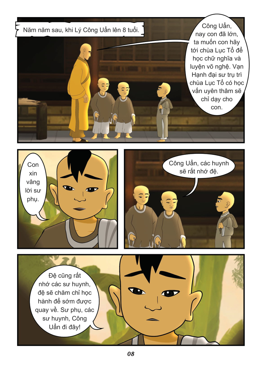 Bộ sách “Truyện tranh lịch sử Việt Nam – Khát vọng non sông” gồm hàng trăm tập, giới thiệu ngắn gọn, sinh động những truyền thuyết đầy tính nhân văn và những sự kiện, những nhân vật nổi tiếng trong lịch sử hàng nghìn năm của dân tộc Việt Nam. Lý Công Uẩn-Tuổi thơ và hoài bão: Ngay từ khi còn nhỏ, Lý Công Uẩn được theo học Đại sư Vạn Hạnh tại chùa Lục Tổ, được lĩnh hội sâu sắc giáo lý của Đức Phật. Những điều Phật dạy ngày càng bồi đắp trong tâm khảm của ông chí lớn một lòng vì muôn dân xã tắc. Ông làm cấm quân dưới triều Lê Trung Tông, giữ chức Điện tiền chỉ huy sứ, sau đó được quan chi hậu Đào Cam Mộc tiến hành cuộc vận động đưa Lý Công Uẩn lên ngôi, sáng lập ra triều Lý, đưa nước ta sang một trang sử mới.