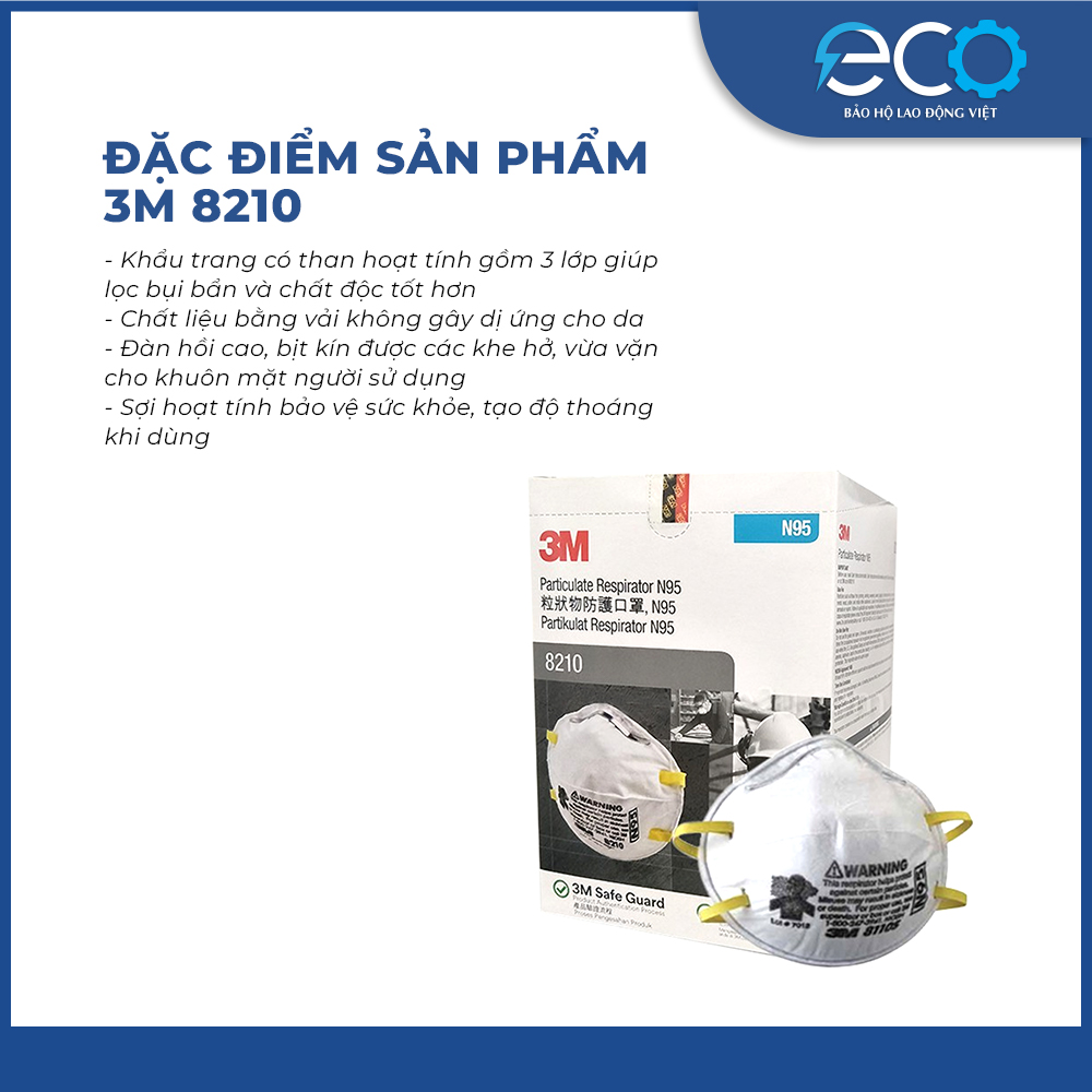 Khẩu trang 3M 8210 N95 là sản phẩm cao cấp đạt tiêu chuẩn N95 của NIOSH (Viện Sức khỏe và An toàn Lao động Mỹ), giúp bảo vệ hệ hô hấp khỏi các hạt bụi