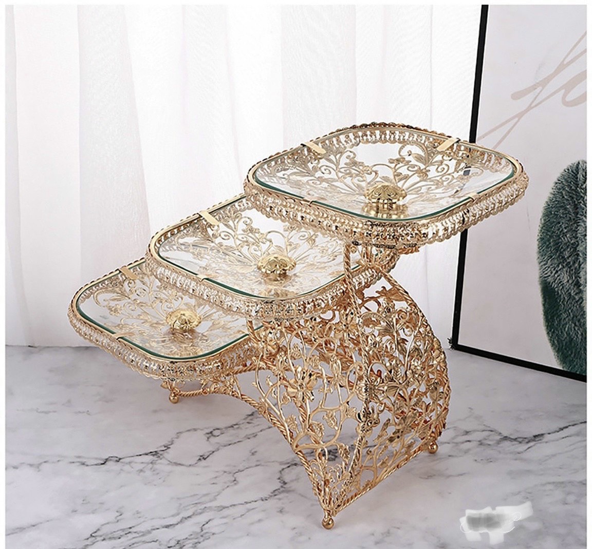 ✨KHAY ĐỰNG HOA QUẢ BÁNH KẸO THỦY TINH KHUNG KIM LOẠI TRẠM KHẮC HOA VĂN SANG TRỌNG 3 TẦNG - VD30