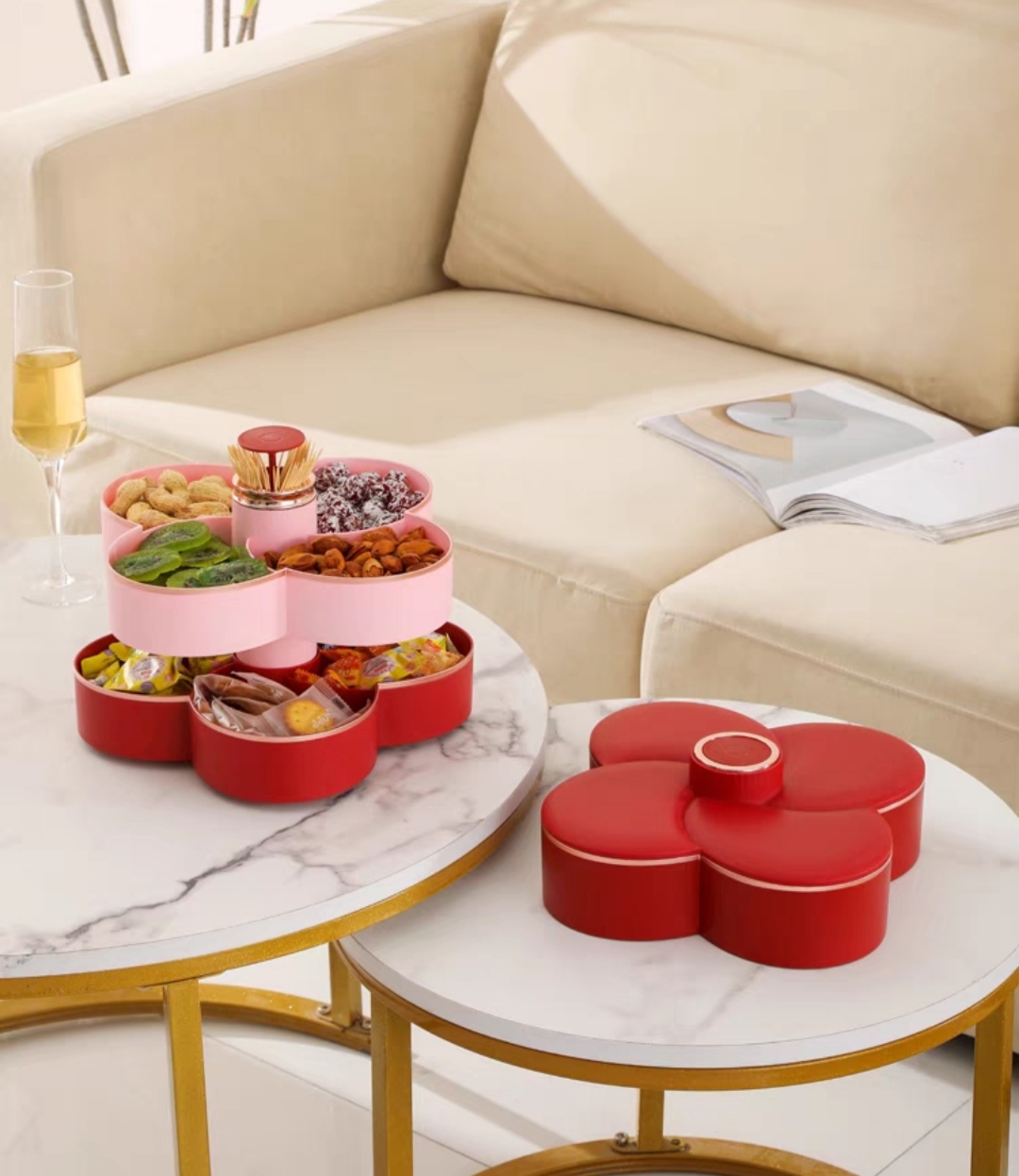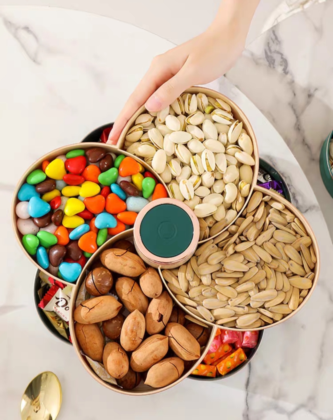 Khay mứt tết, khay đựng bánh kẹo, hoa quả, đồ ăn vặt. Khay mứt 5 cánh sen xoay 360 độ sang trọng