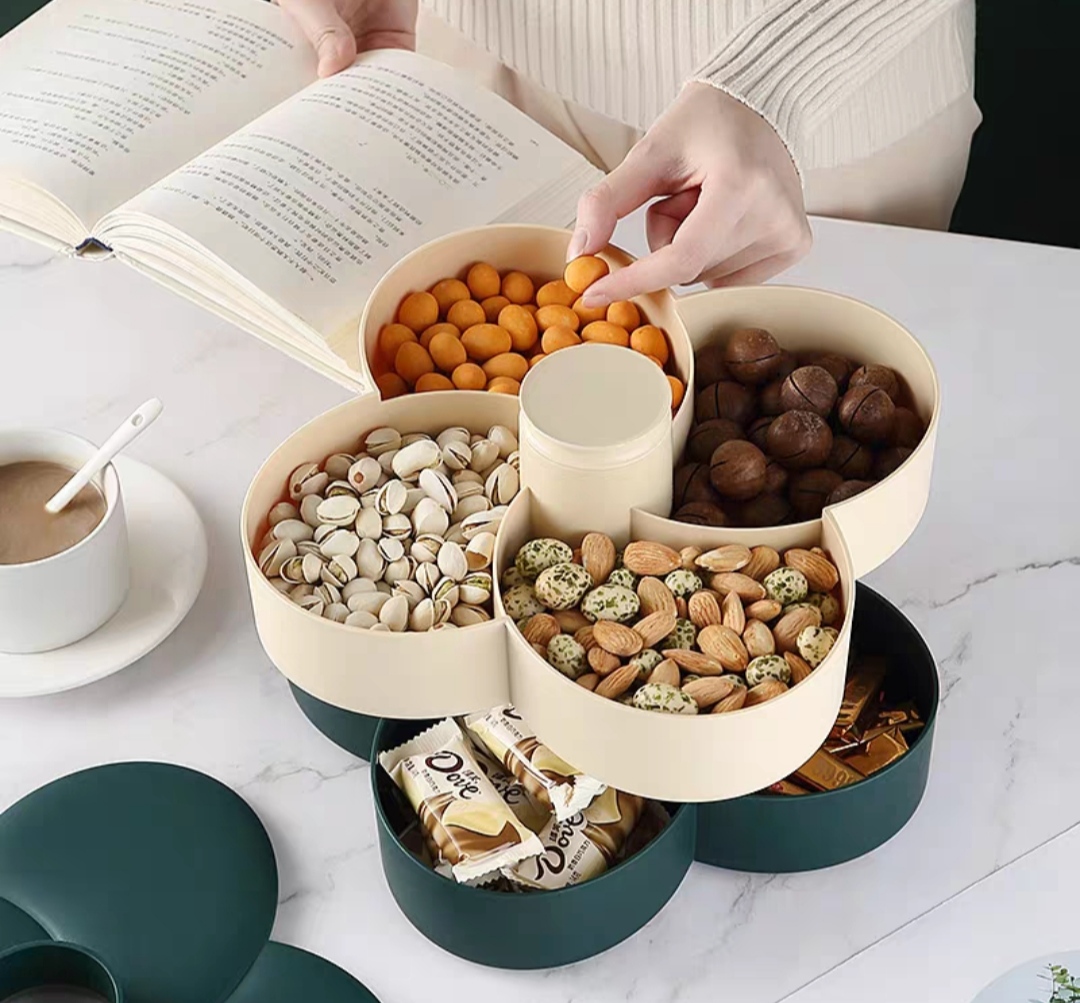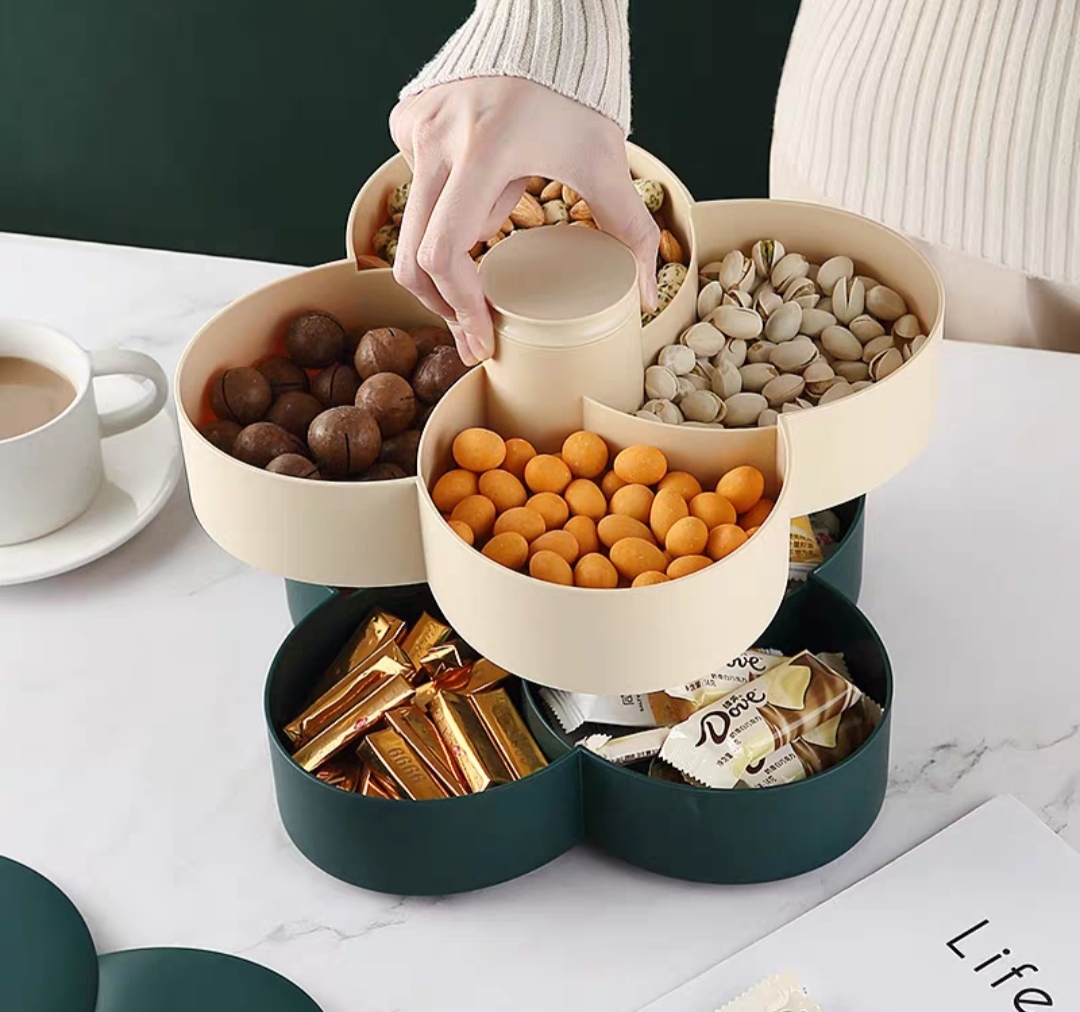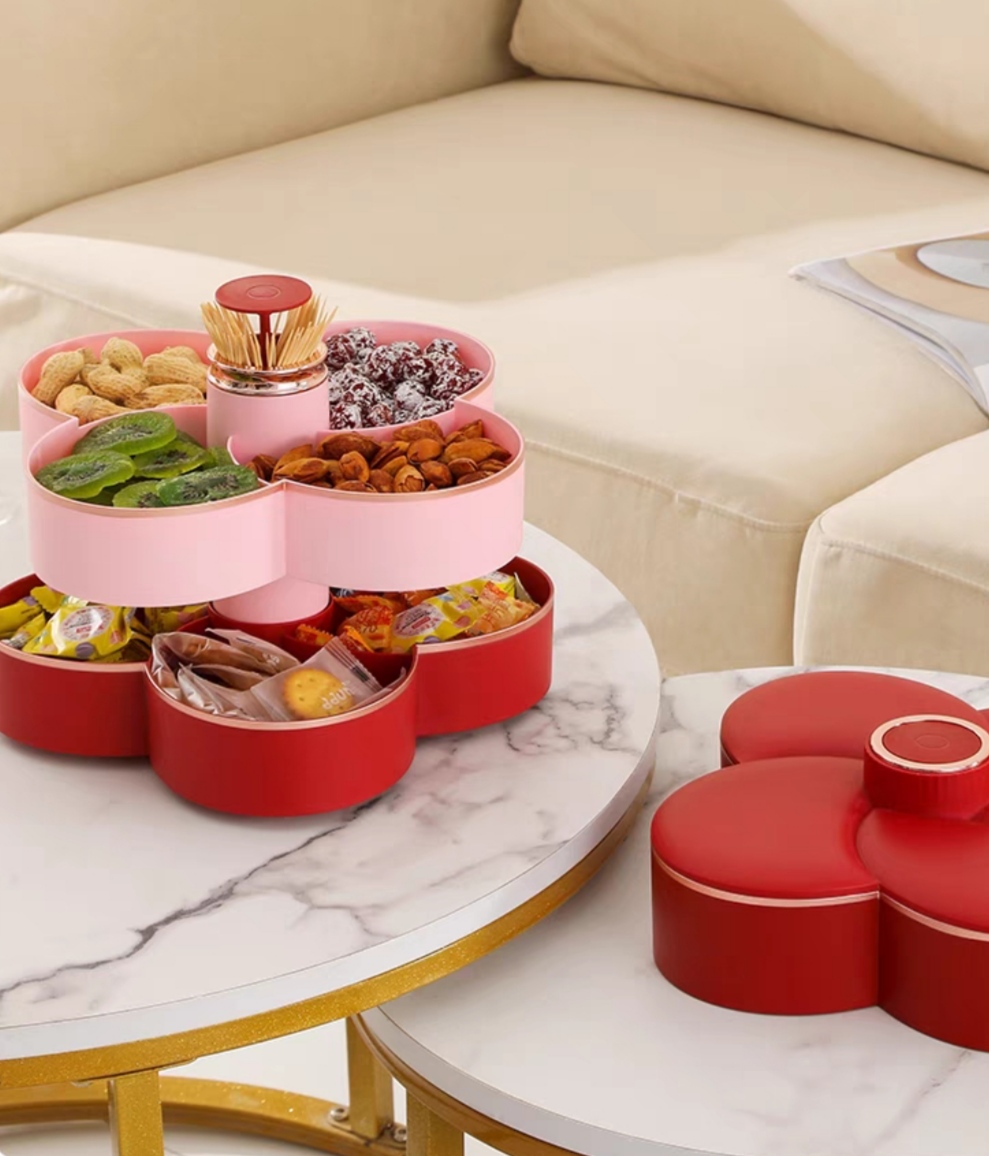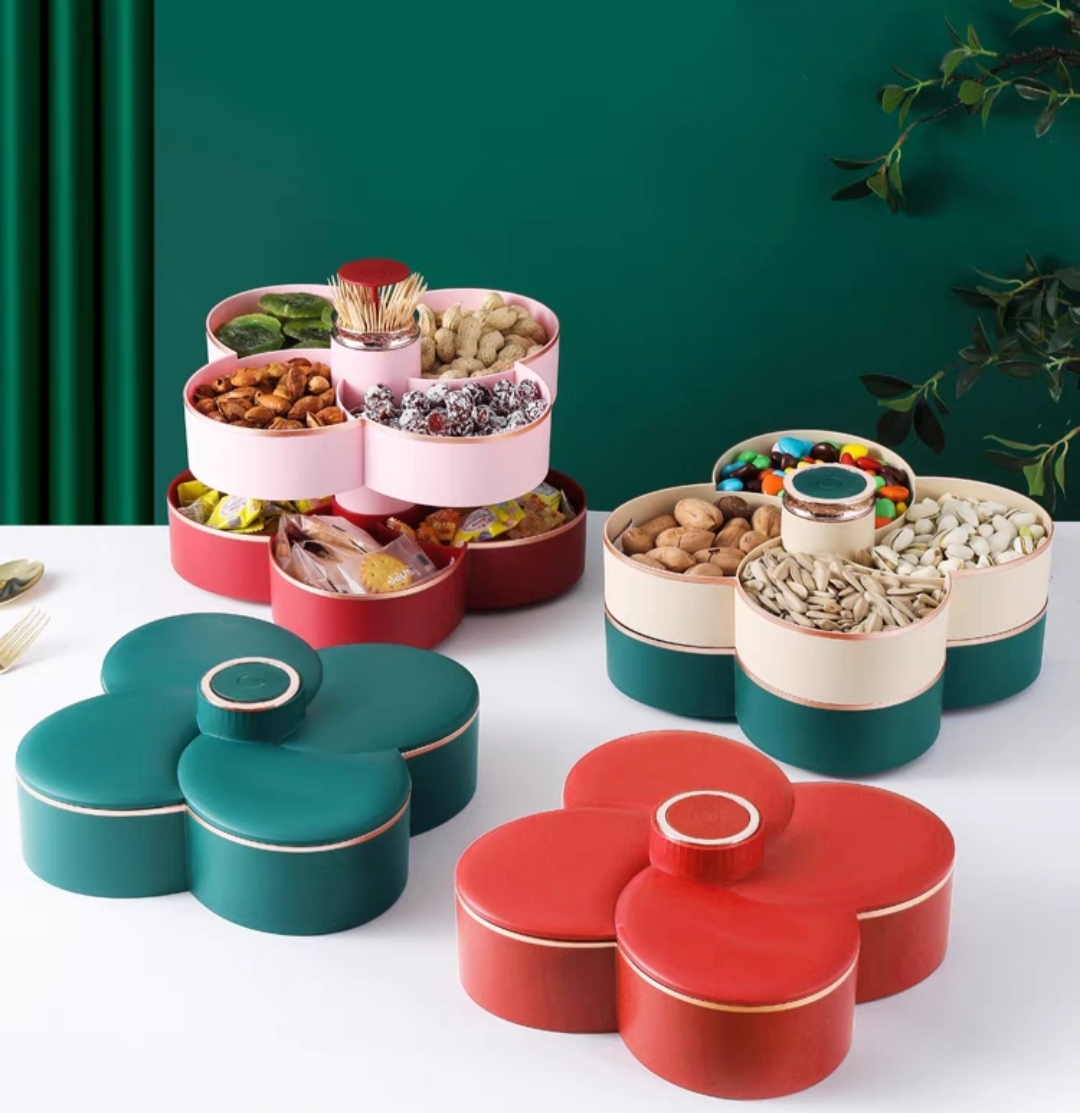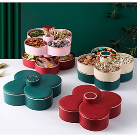 Khay mứt tết 2 tầng xoay 360 độ nhựa cao cấp, khay đựng bánh kẹo tết 2025 hình hoa 10 cánh