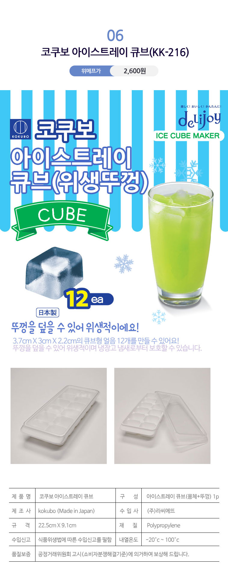 Khay làm đá Yukipon Cube 12 viên ■ Xuất xứ: Nhật Bản | MADE IN JAPAN ■ NSX: Kokubo Kogyosho Co., Ltd (Japan) ■ Model: KK-216 ■ Kích thước: 255 x 124 x 35Hmm ■ Màu sắc: Màu trắng