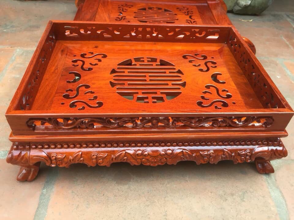 _ Khay đựng trà được thiết kế theo hình chữ nhật ,thân và dạ khay được điêu khắc trạm trổ tỉ mỉ ,tinh sảo kỳ công .Đi hều hết tất cả mọi chi tiết góc ngách nội dung hoa văn của khay trà ,đều được gọt tỉa chỉnh sắc nét hoàn toàn bằng tay thủ công .Đồng thời khay trà được kiểm định kỹ lưỡng khắt khe ư cho vào thẩm sấy cho gỗ khô kiệt .Mục đích trống dập nứt vênh mo mối mọt .Kết hợp với trà nhám , Đánh giấy giáp nhiều nước ,cho sạch sẽ sờ mát lạnh .Song cho vào phun lót làm bóng mờ để giữ lại mầu sắc vân gỗ tự nhiên .Khay trà được làm và hoàn thiện do bàn tay khối óc tài hoa ,Từ những người thợ dầy rặn kinh nghiệm , Trong làng nghề truyền thống .Chính vì thế khay trà đựng ấm nước đã đáp ứng đầy đủ mọi tiêu trí cần thiết như ( Đẹp bền rẻ ) Thẩm mỹ nghệ thuật với chất lượng tuyệt vời