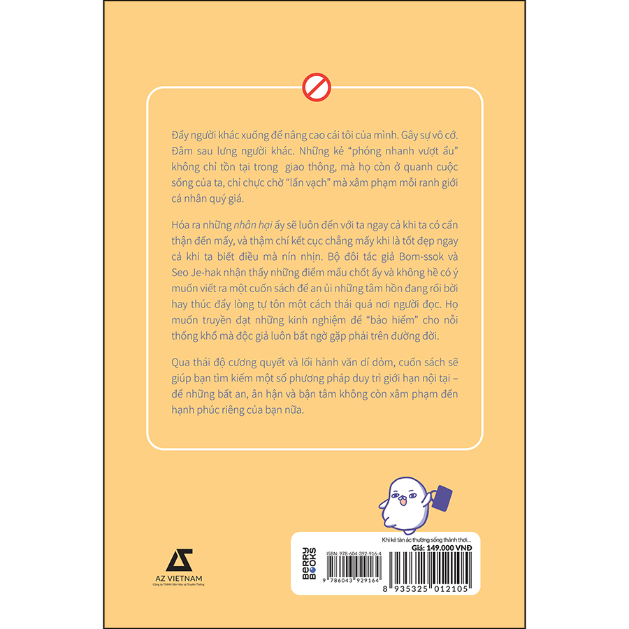 Hóa ra những nhân hại ấy sẽ luôn đến với ta ngay cả khi ta có cẩn thận đến mấy, và thậm chí kết cục chẳng mấy khi là tốt đẹp ngay cả khi ta biết điều mà nín nhịn. Bộ đôi tác giả Bom-ssok và Seo Je-hak nhận thấy những điểm mấu chốt ấy và không hề có ý muốn viết ra một cuốn sách để an ủi những tâm hồn đang rối bời hay thúc đẩy lòng tự tôn một cách thái quá nơi người đọc. Họ muốn truyền đạt những kinh nghiệm để “bảo hiểm” cho nỗi thống khổ mà độc giả luôn bất ngờ gặp phải trên đường đời.