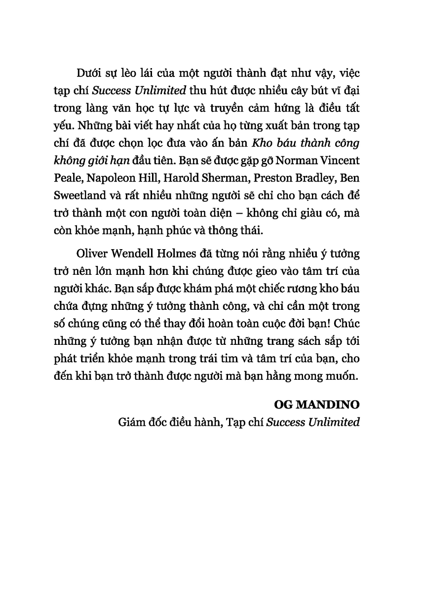 Sau thành công của tạp chí, nhiều yêu cầu làm một bản tuyển tập các bài báo của độc giả được gửi tới, và đó là lý do cuốn sách Kho báu thành công không giới hạn ra đời. Kho báu thành công không giới hạn là cuốn sách tập hợp 47 bài báo hay nhất do Og Mandino kỳ công lựa chọn và biên soạn từ tờ tạp chí nổi tiếng Un.limited. Trong cuốn sách này, độc giả sẽ được gặp gỡ những nhân vật nổi tiếng như Napo.leon Hill, W. Cle.ment Stone, O.rison Marden hay Charlie “Tremendous” Jones… những cá nhân thành công sẽ hướng dẫn bạn tìm đến hạnh phúc, sự kh.ỏe mạnh về cả thể chất lẫn tinh thần, năng lực và sự giàu có thông qua những câu chuyện đáng suy ngẫm. Mỗi câu chuyện trong cuốn sách này chứa đựng một thông điệp dành riêng cho bạn, chúng sẽ thúc đẩy bạn khai phá năng lực vô hạn trong tâm trí mình.