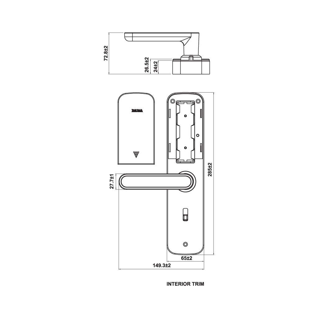 THÔNG SỐ KĨ THUẬT Kích thước mặt trong, ngoài: 42.5x430mm Nguồn cung cấp: 6V (4 pin AA) Tuổi thọ pin: Mở cửa 3.000 lần Nguồn điện khẩn cấp: 5V-1A, Micro USB Dây cáp sạc: Có