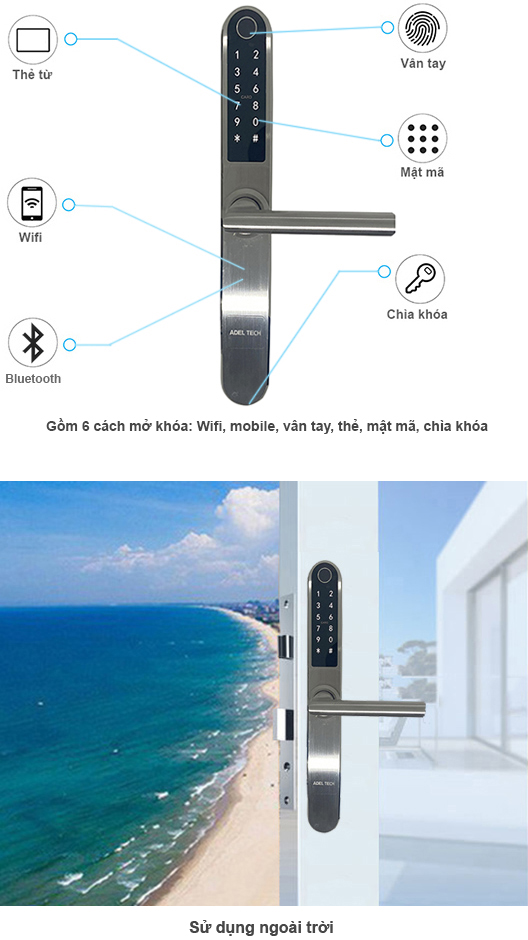 Tính năng sản phẩm 1. Mở khóa từ xa bằng App (Wifi, IR Remote, RE QA code) 2. Mở khóa bằng vân tay 3. Mở khóa bằng thẻ từ 4. Mở khóa bằng mật mã