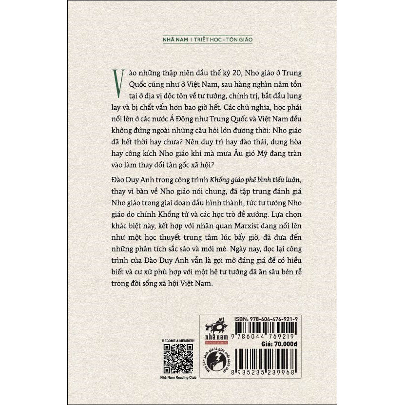 Nhằm đưa ra kiến giải riêng, Đào Duy Anh với công trình Khổng giáo phê bình tiểu luận thay vì bàn về Nho giáo nói chung, đã tập trung đánh giá Nho giáo trong giai đoạn đầu hình thành, tức tư tưởng Nho giáo do chính Khổng tử và các học trò đề xướng. Lựa chọn khác biệt này, kết hợp với nhãn quan Marxist đang nổi lên như một học thuyết trung tâm lúc bấy giờ, đã đưa đến những phân tích sắc sảo và mới mẻ. Ngày nay, đọc lại công trình của Đào Duy Anh vẫn là gợi mở đáng giá để có hiểu biết và cư xử phù hợp với một hệ tư tưởng đã ăn sâu bén rễ trong đời sống xã hội Việt Nam.