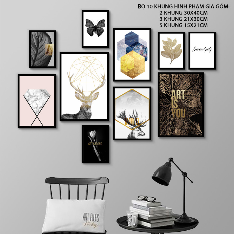 Kích Thước Bộ Khung gồm: 2 khung 30x40cm, 3 khung 21x30cm, 5 khung 15x21cm (Tổng kích thước sau khi treo khoảng 90x130cm)TẶNG:     - Tặng Bộ ảnh như hình Mẫu     - Tặng sơ đồ định vị không cần đo...