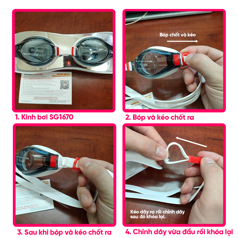 - Đeo cố định vị trí mắt trước, kéo dây ra sau đầu. Điều chỉnh dây đeo cho phù hợp với đầu.